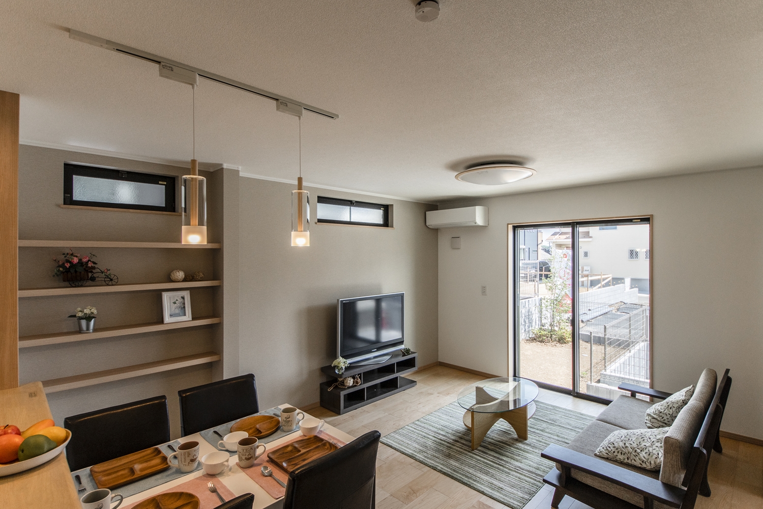 大きな窓から自然のやさしい光が降り注ぐ、明るく開放的なリビング。