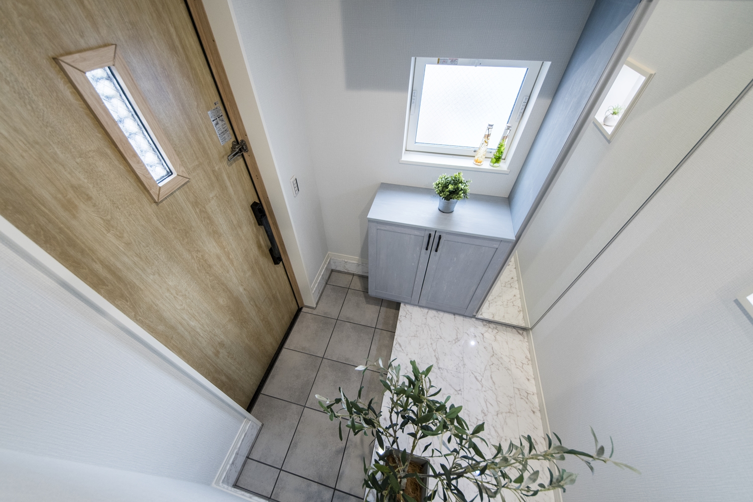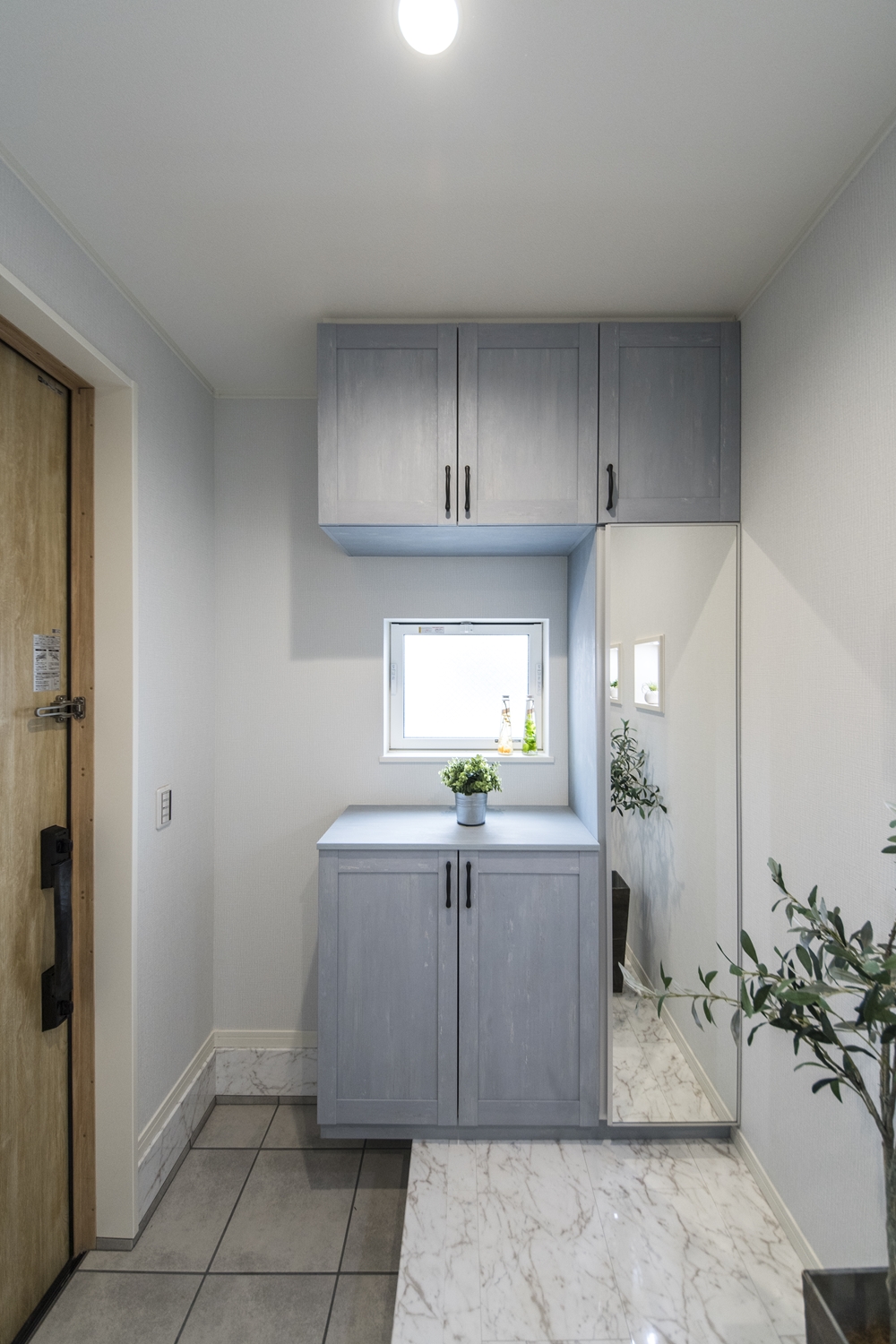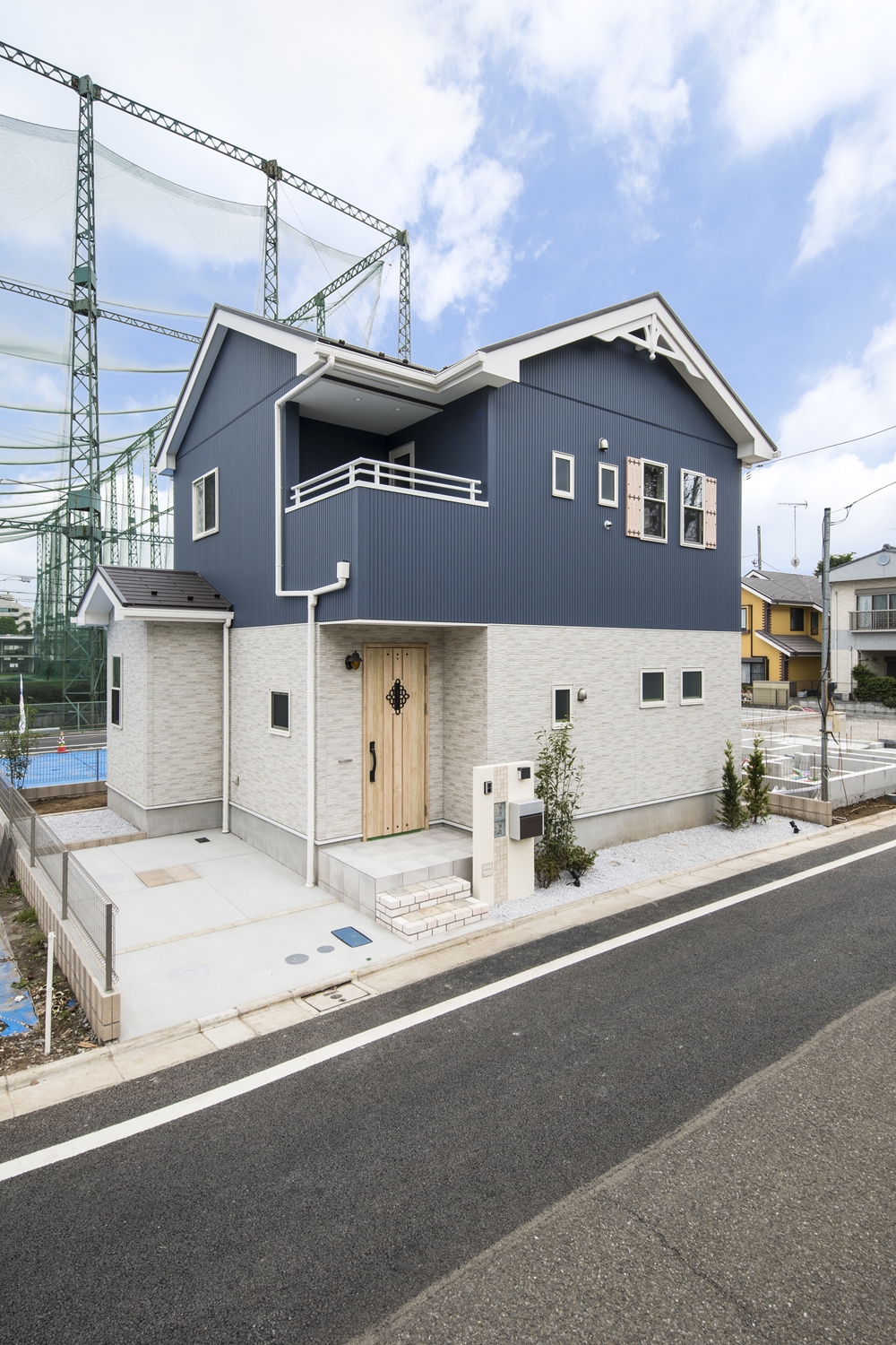 鮮やかなブルーと白系のサイディングを上下に張り分けた目を惹く北欧風の外観。アンティーク調のドアやポーチライトを施した、おしゃれな玄関まわり。