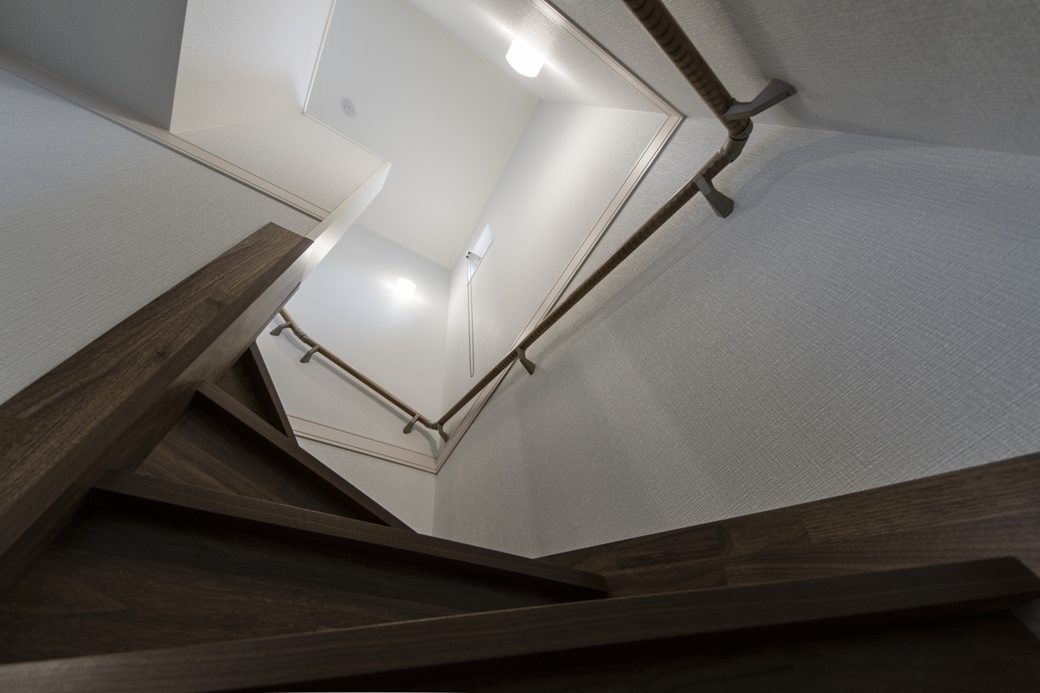 白い壁に、ブラックウォルナットの深い色味の階段。メリハリのある落ち着いた空間に仕上がりました。