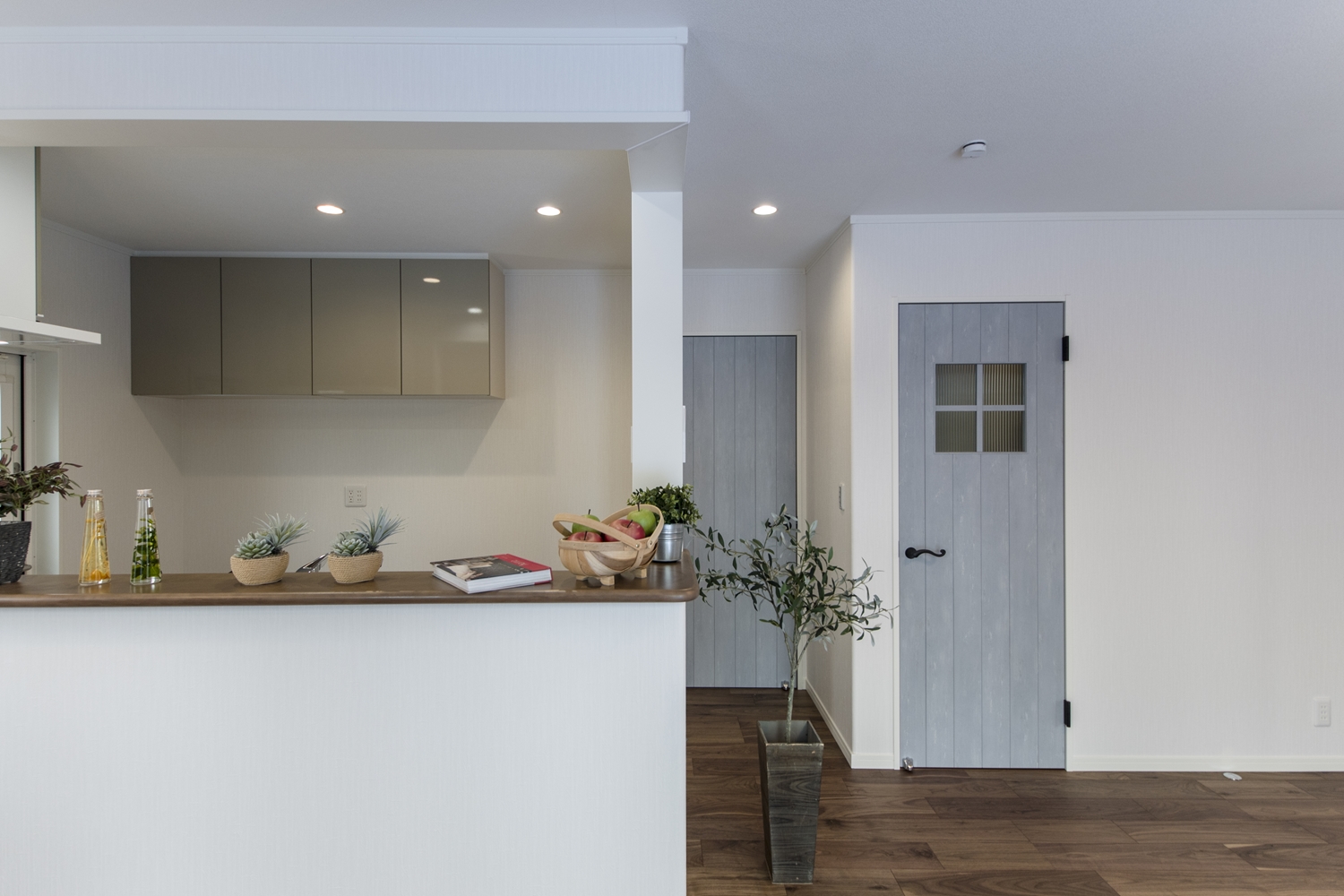 家族のコミュニケーションをはぐくむ対面式キッチン。キッチンカウンターにはアイテムを飾ったりインテリアも楽しめます♪