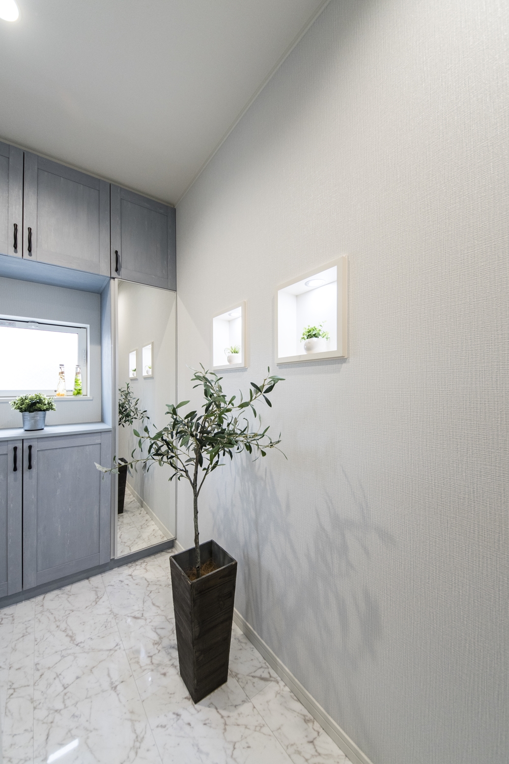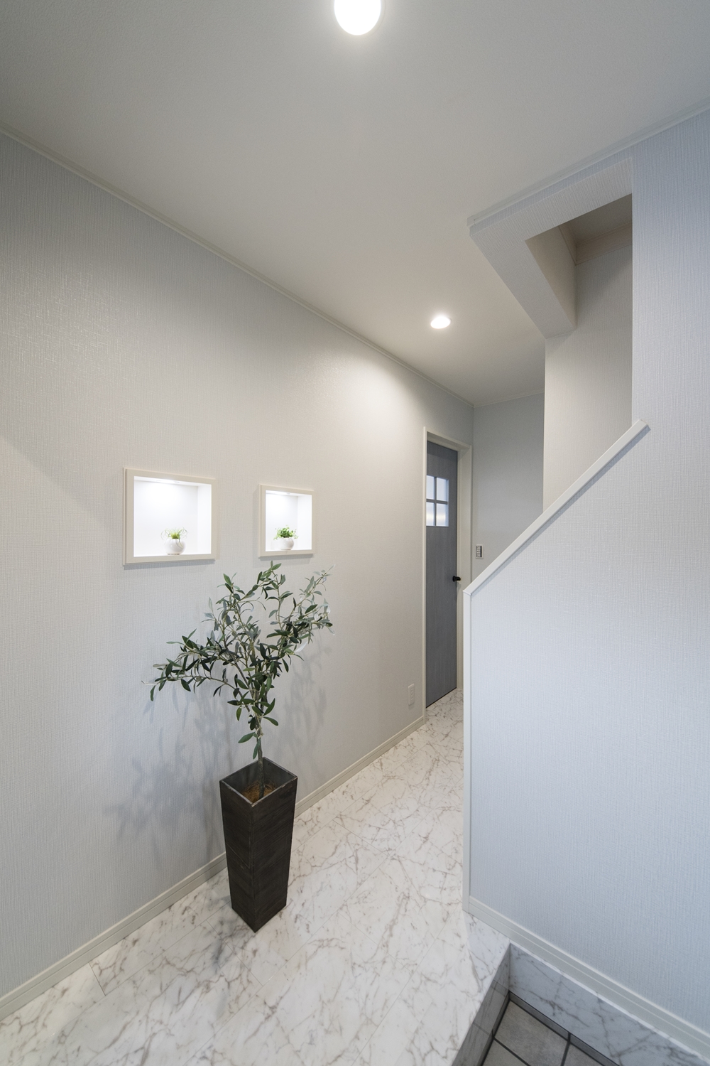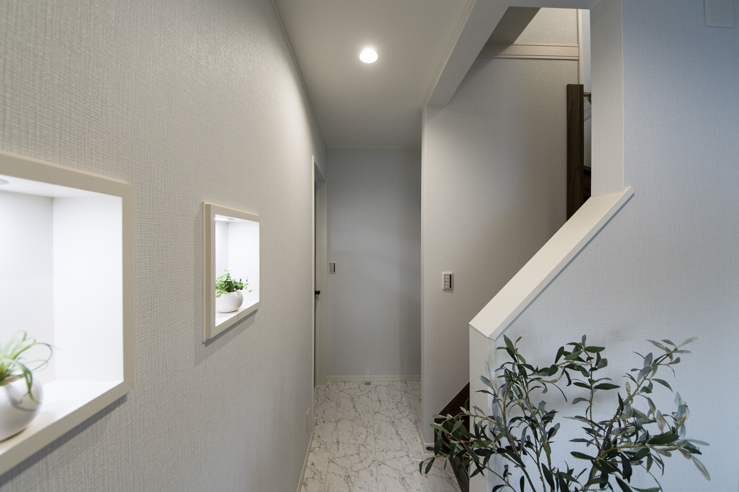 キューブの形が可愛らしいニッチカウンターを設置しました。小物などをおしゃれにディスプレイできます。