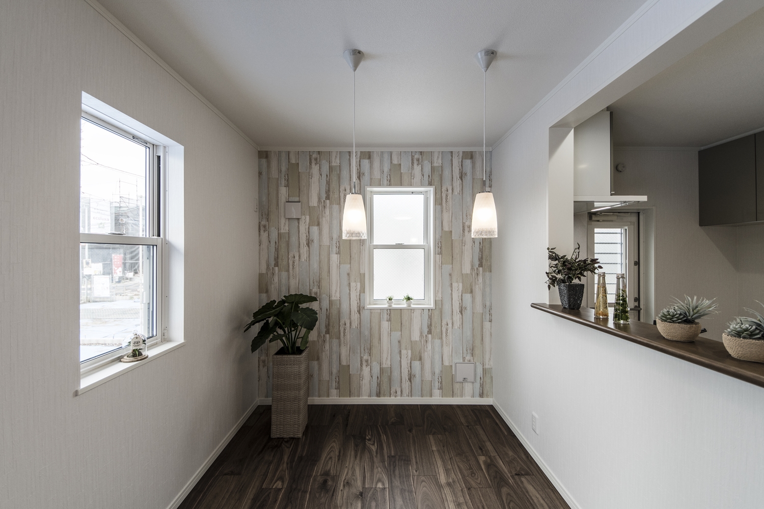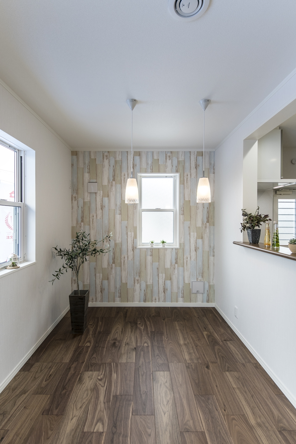 木にペンキを塗ったようなデザインのクロスが、クラシカルで愛らしいシャビーシックな空間を演出します。