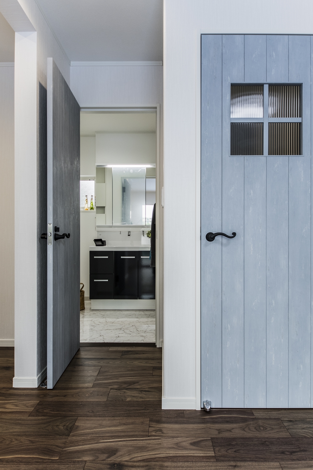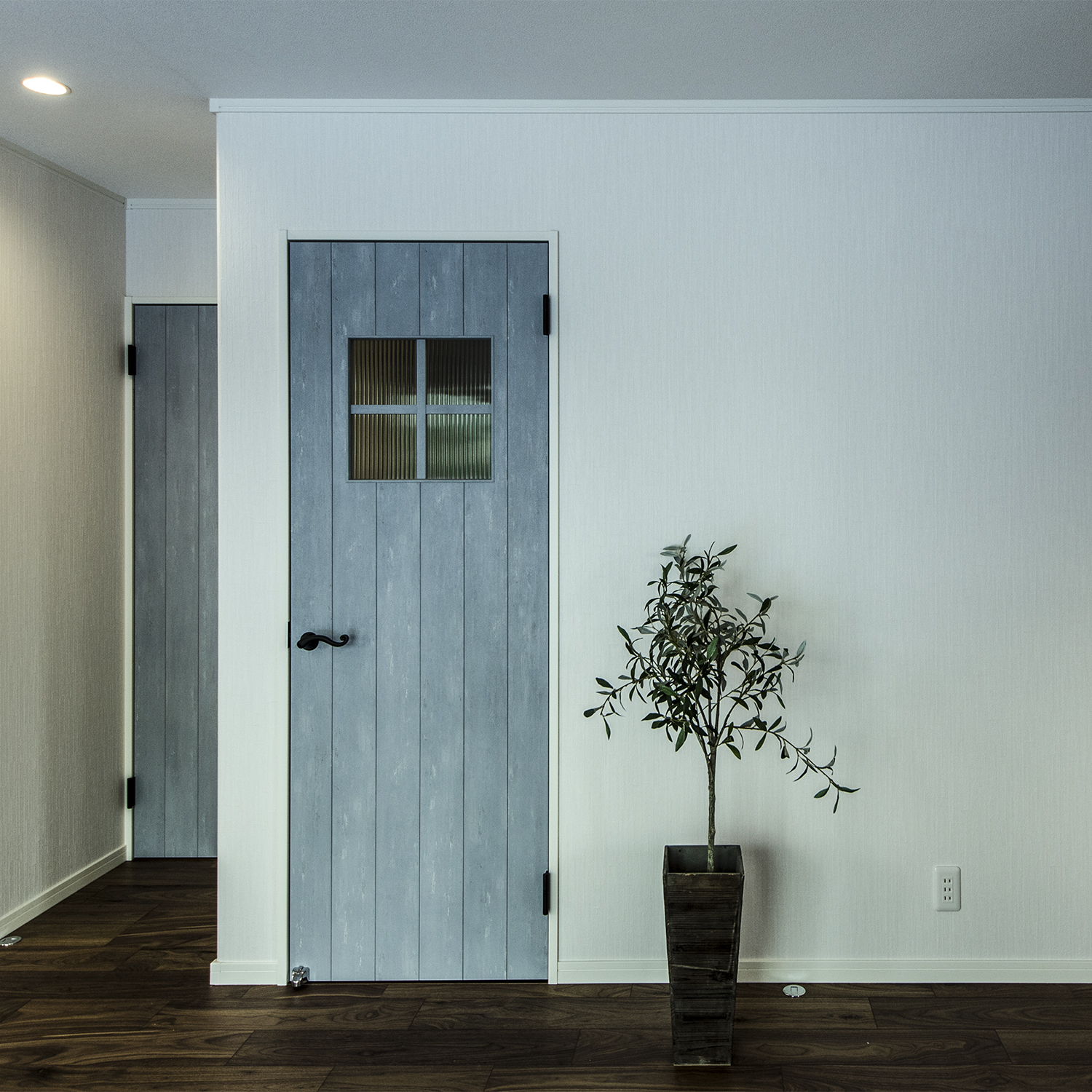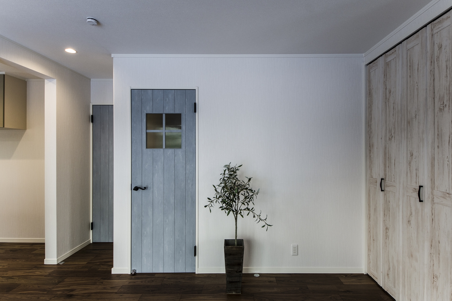 エイジング加工されたブルーペイントのドアが空間を彩ります。