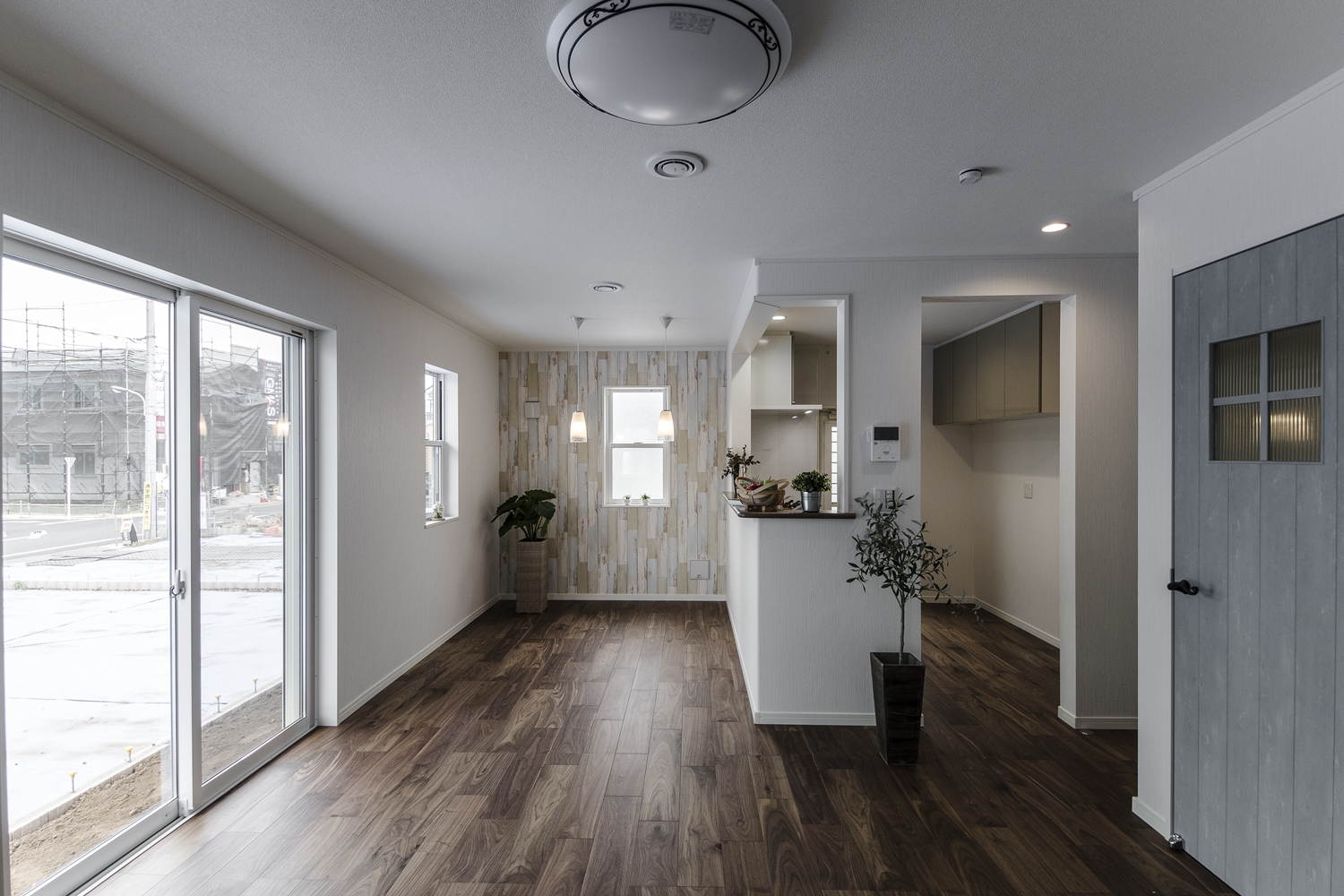 キッチン、リビング、ダイニング全体がとても開放的で一体感があります。