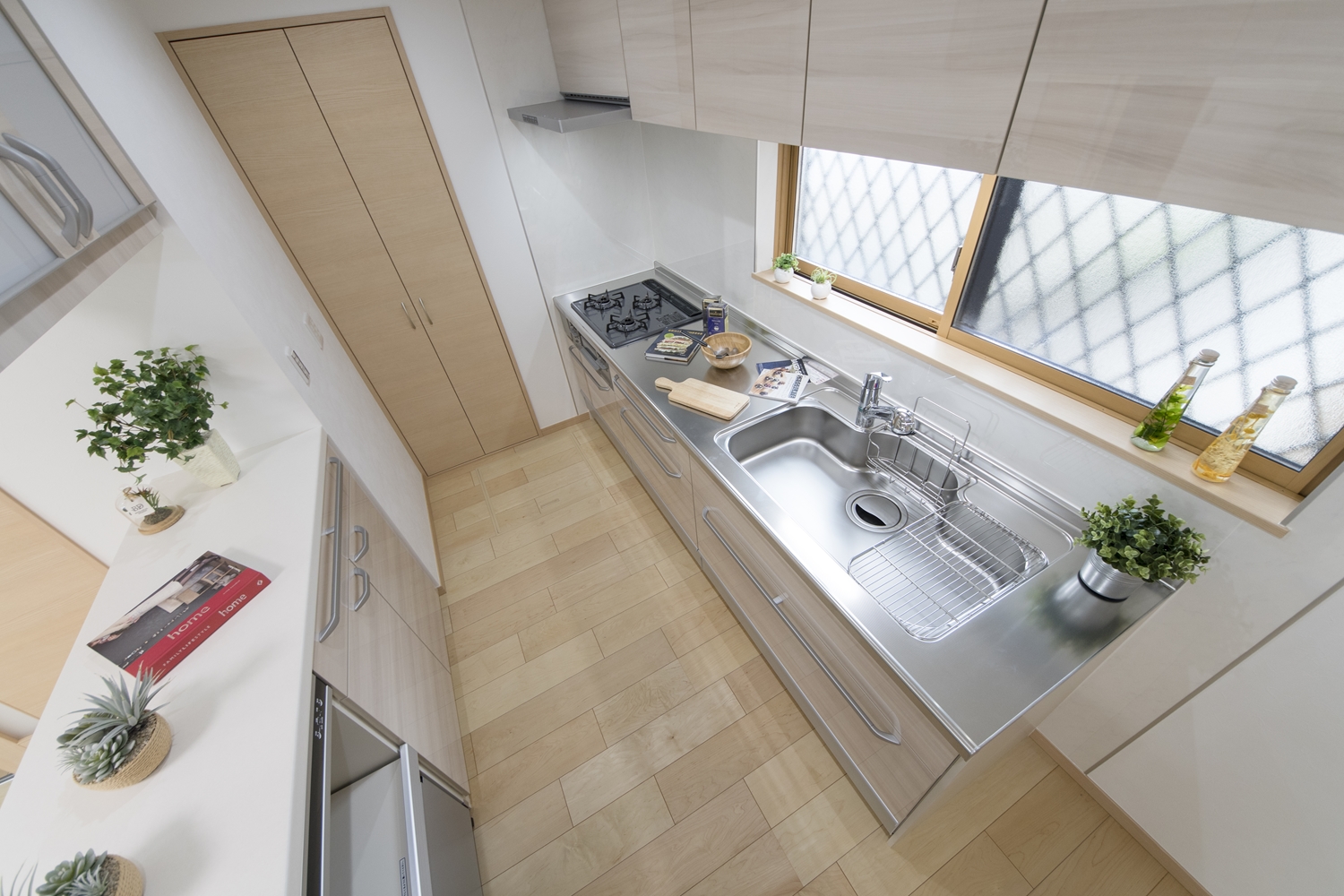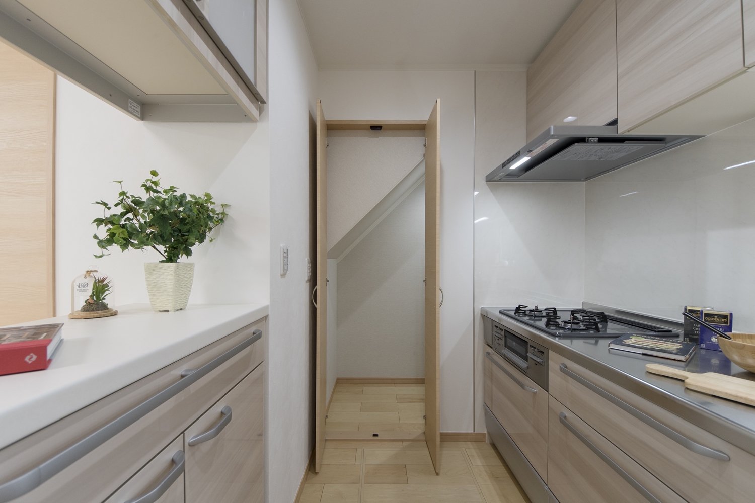 キッチン奥の階段下スペースを有効活用して、パントリーとして使います。