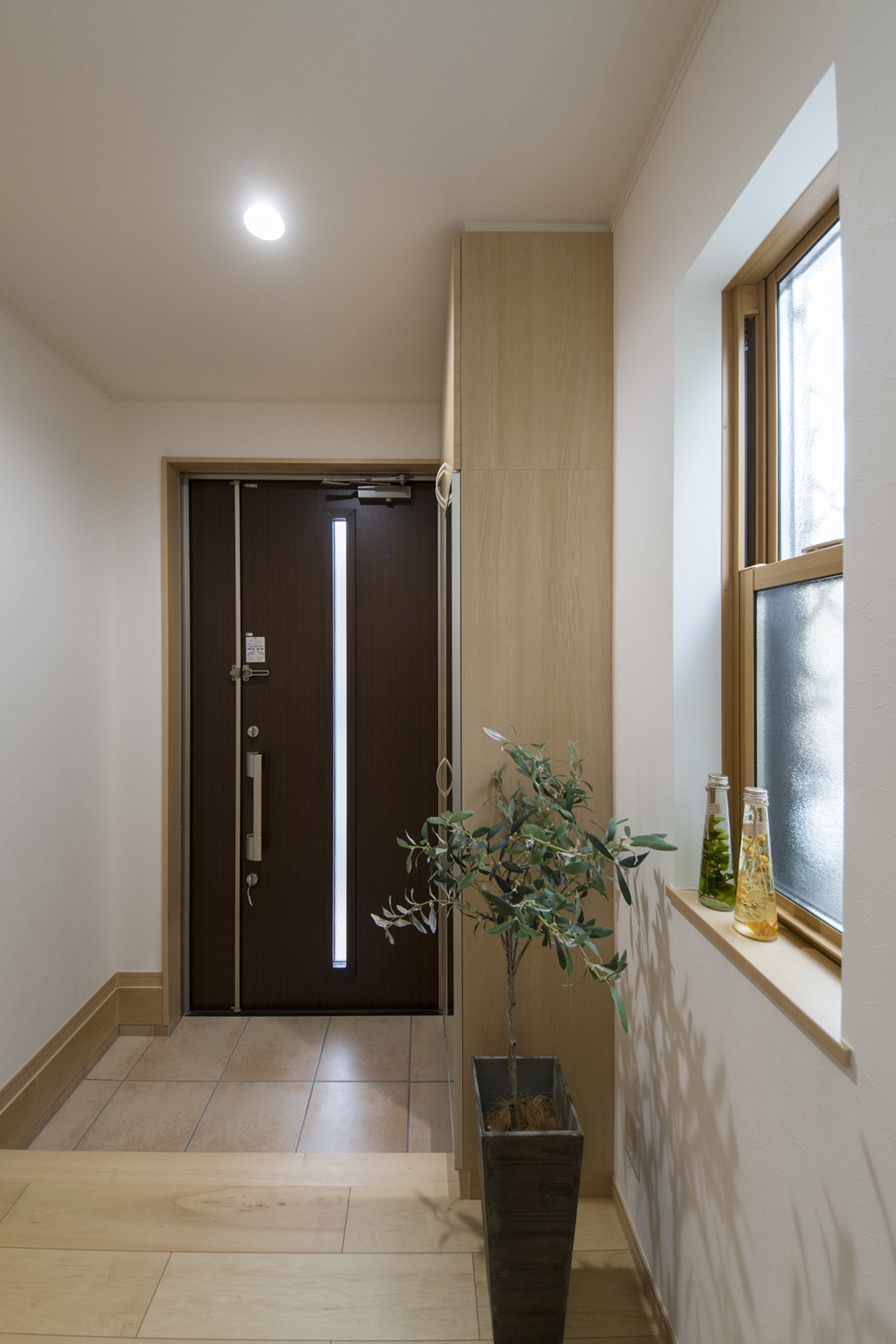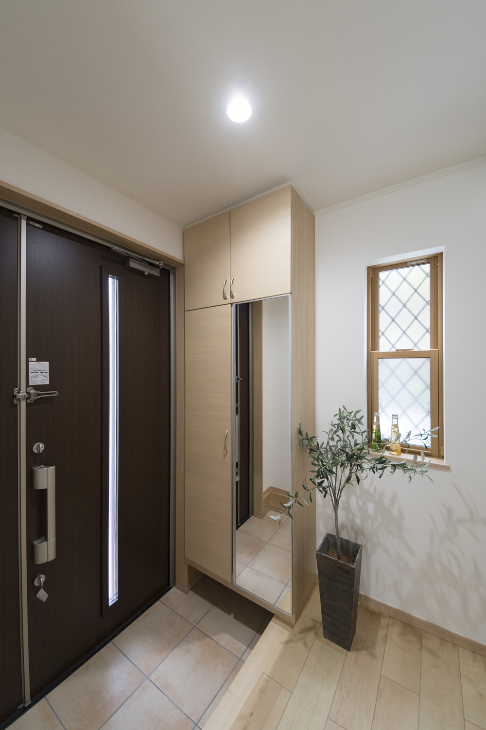 木の温もり感じる木目調のドアと収納、ベージュのテラコッタ調タイルが玄関をナチュラルな雰囲気に包みます。