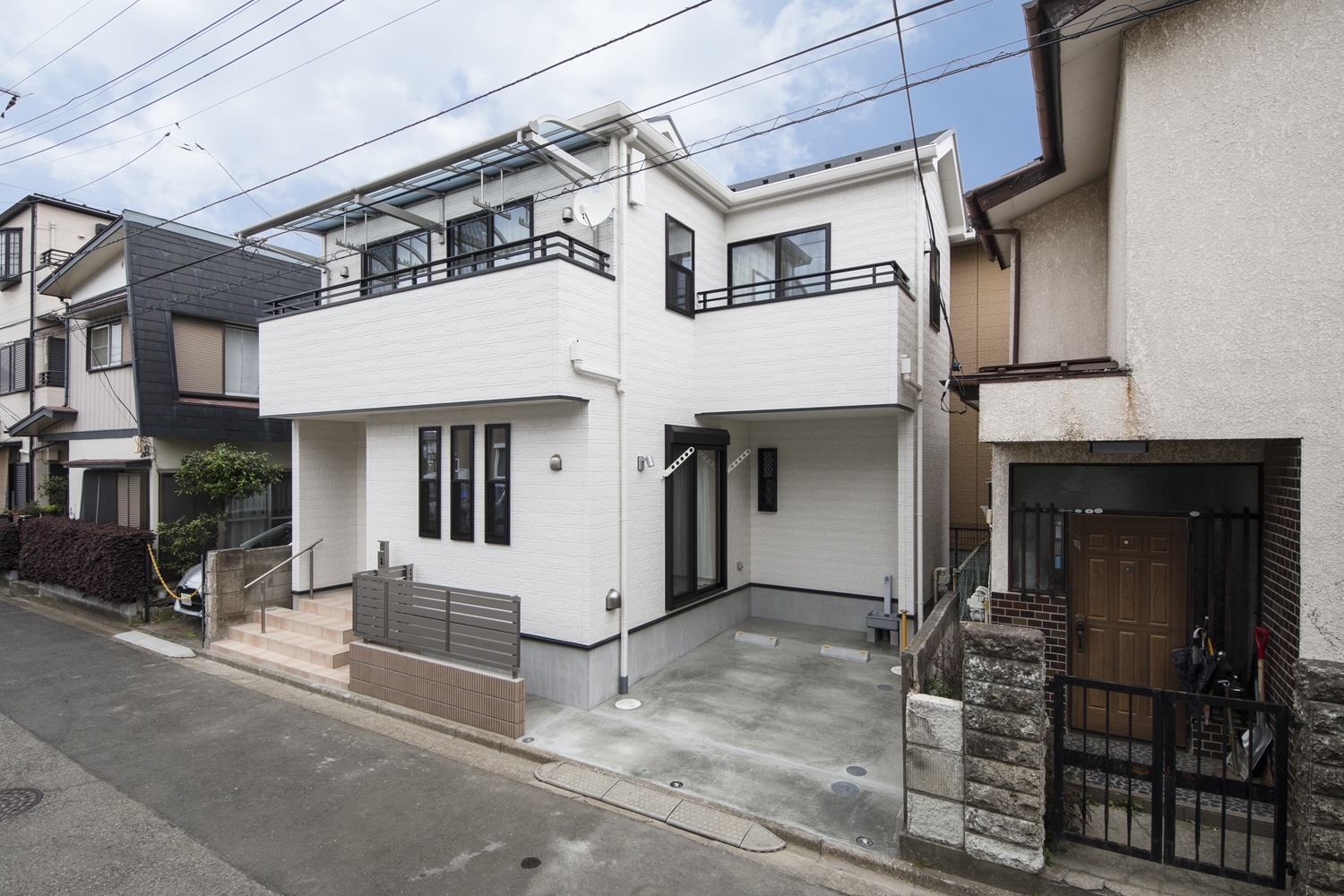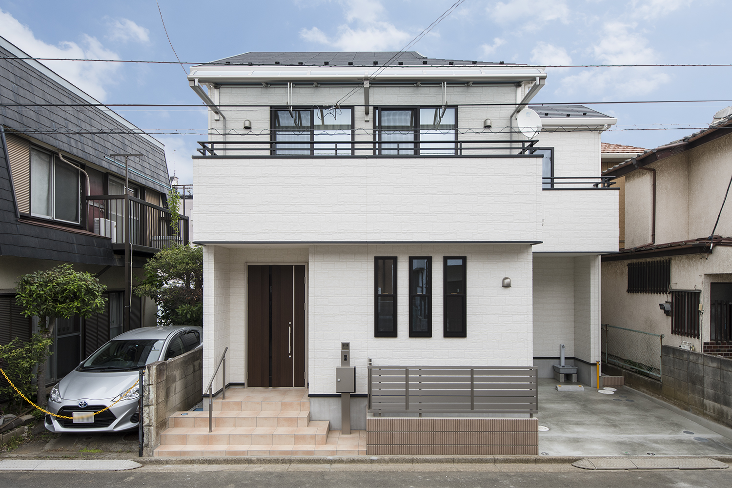 ホワイトの石目調サイディングを基調に、ダークトーンのサッシや玄関扉でメリハリを付けた、スッキリとした印象の外観。