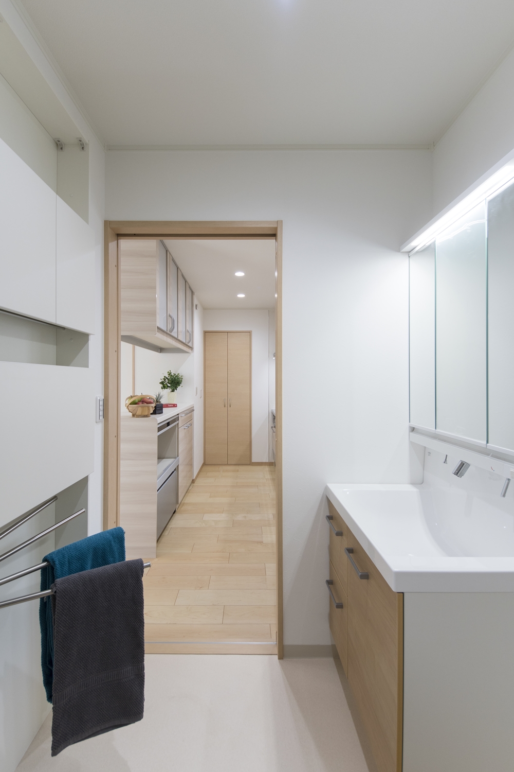 キッチンから洗面室につながるスムーズ動線で、便利さが向上♪家事動線を考えた間取り。