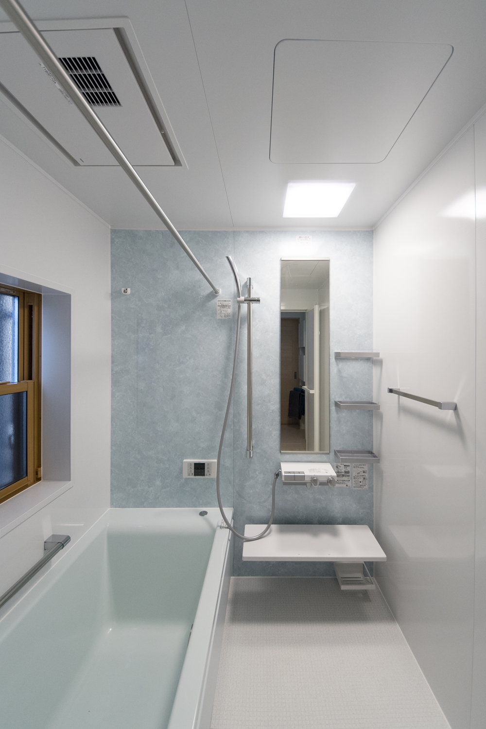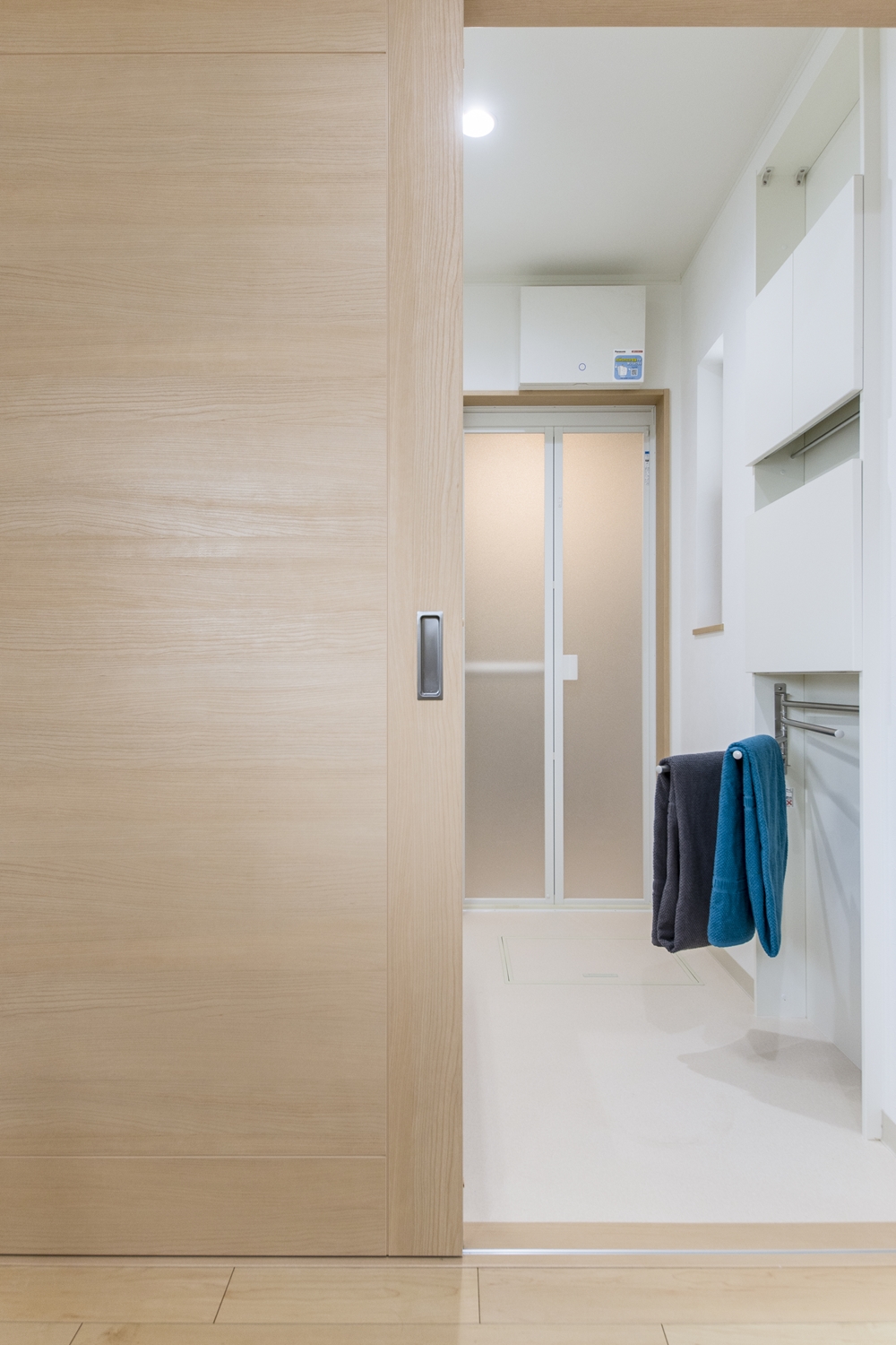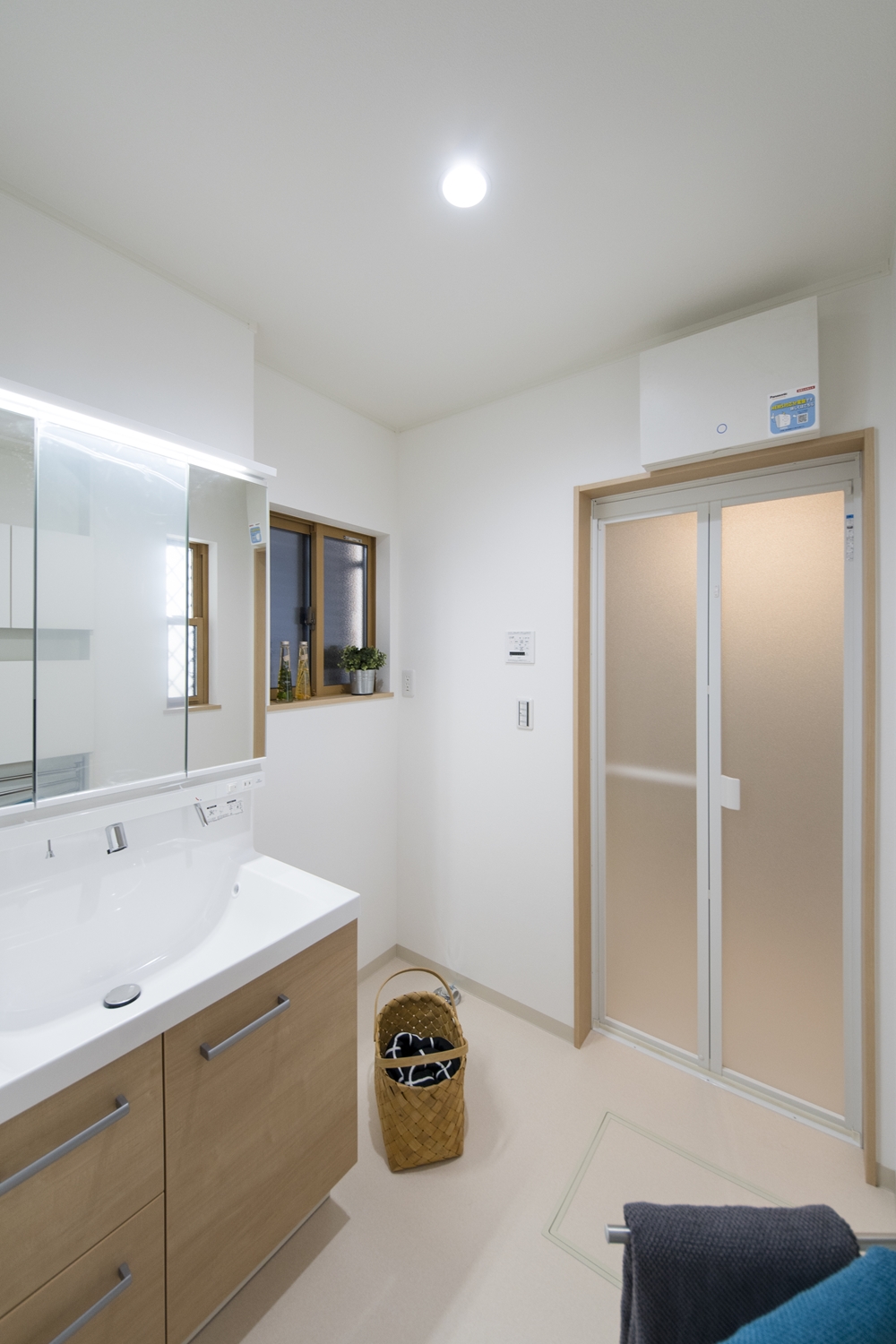 白を基調とした清潔感のあるサニタリールーム。洗面化粧台扉を明るい木目調カラーでアクセントにしました。