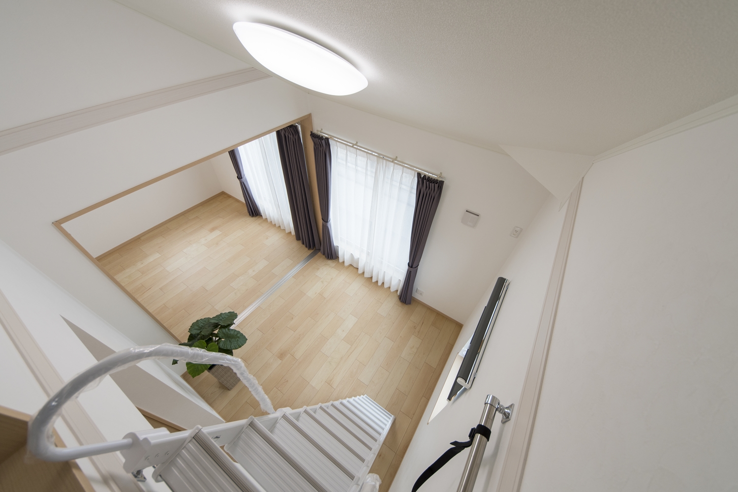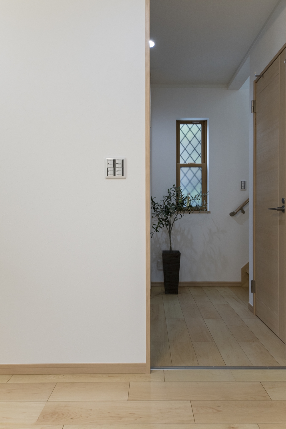 階段ホール/2連の窓から優しい光が差し込む明るい空間。