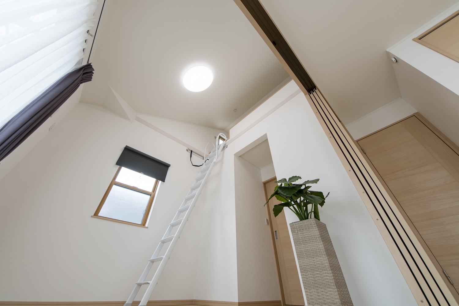 屋根の形に合わせて傾斜を持たせた勾配天井を設えました。空間が広がり開放的です。