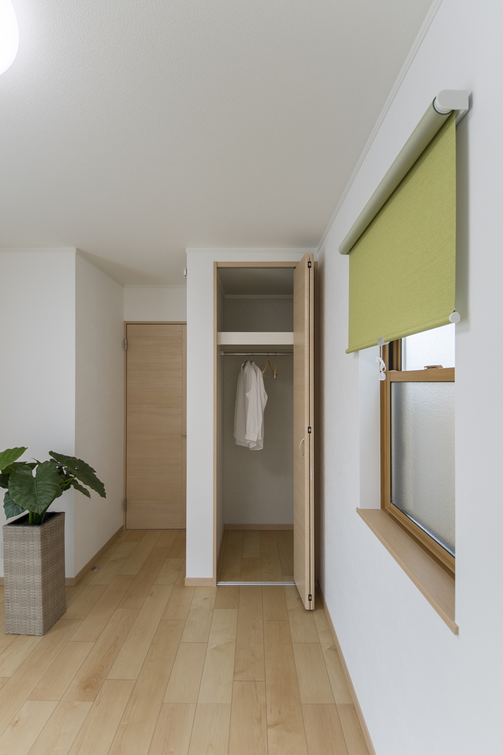オシャレな3連の上げ下げ窓が、やさしい光とさわやかな風を室内へと誘います。ロールスクリーンの色も壁紙と合わせました。