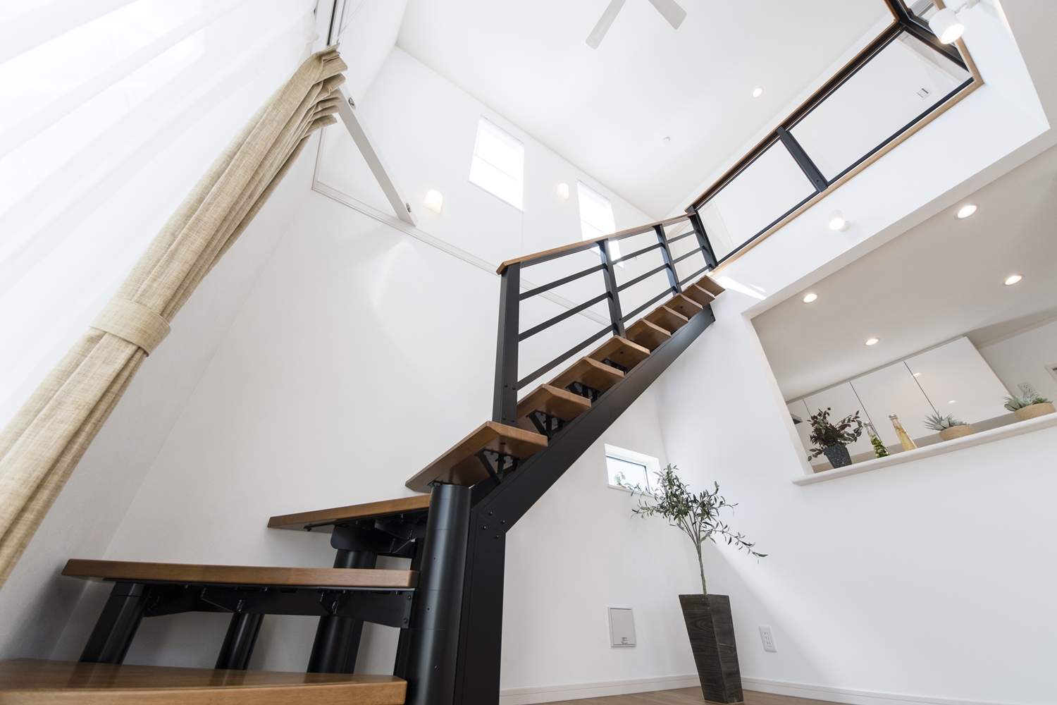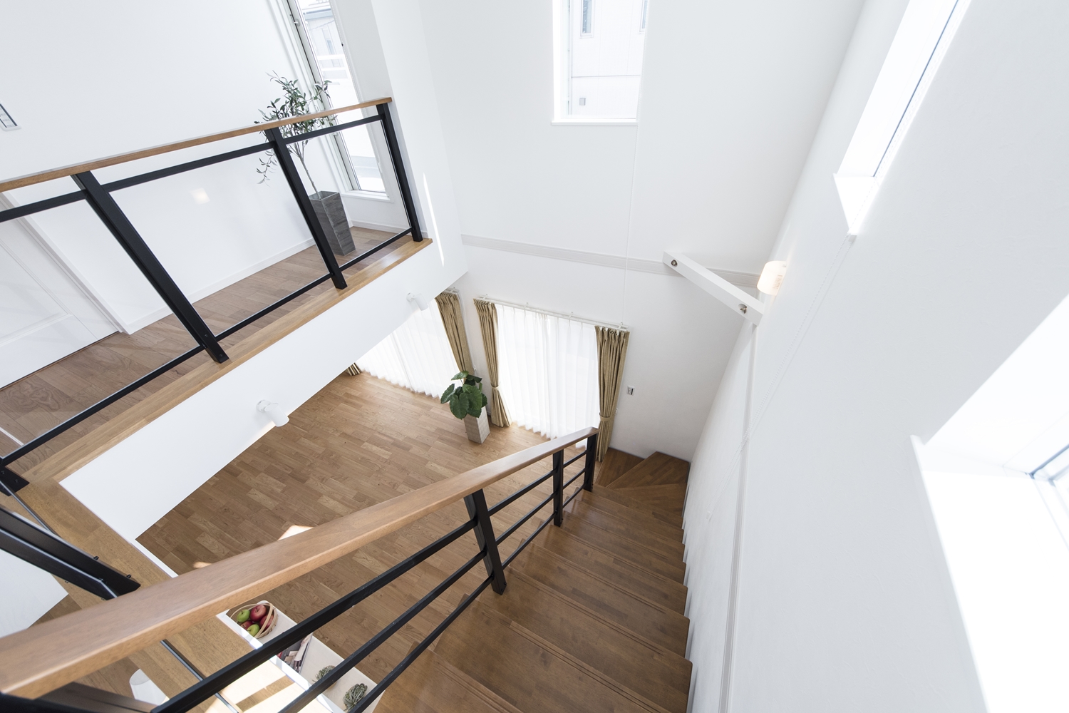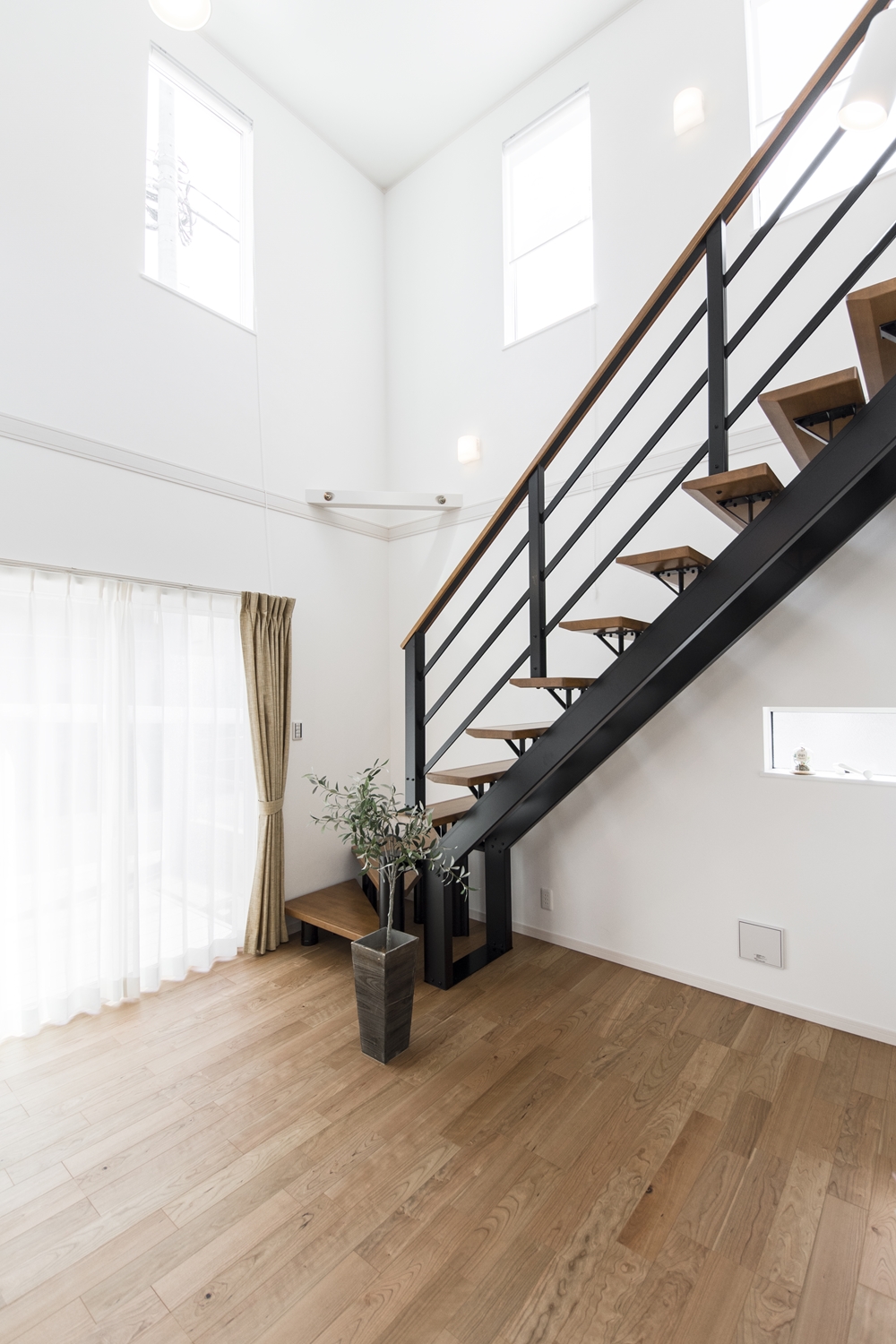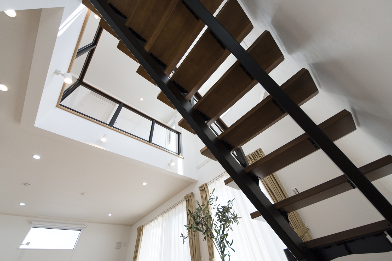 スリット階段と吹き抜けが自慢の明るく開放的な住まい。
