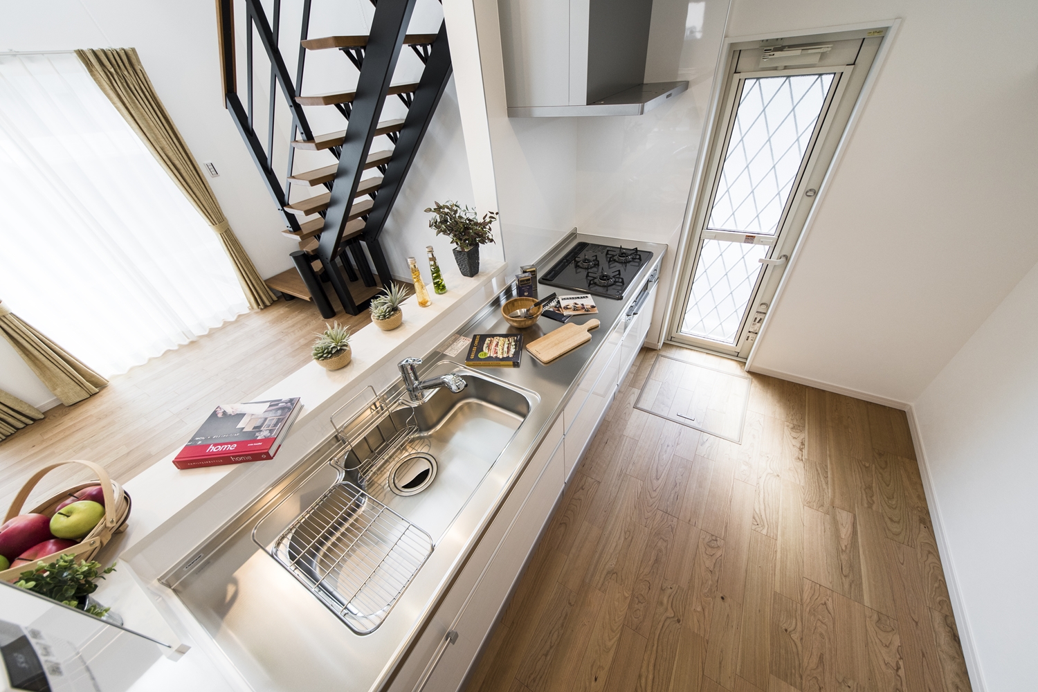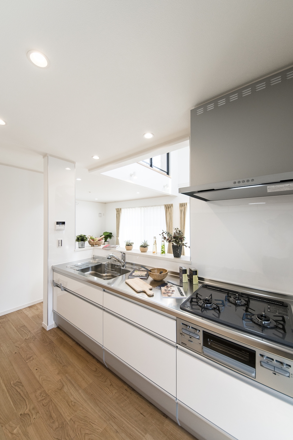 キッチンから見渡すリビングには明るい陽射しと心地よい風が降り注ぎます。