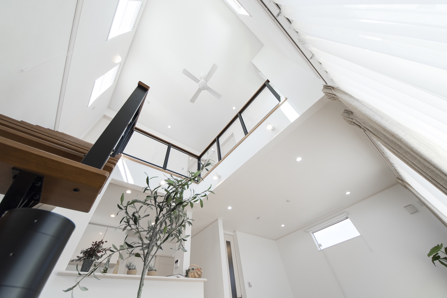 大きな窓と吹き抜けから明るい光が差し込む、快適な空間。