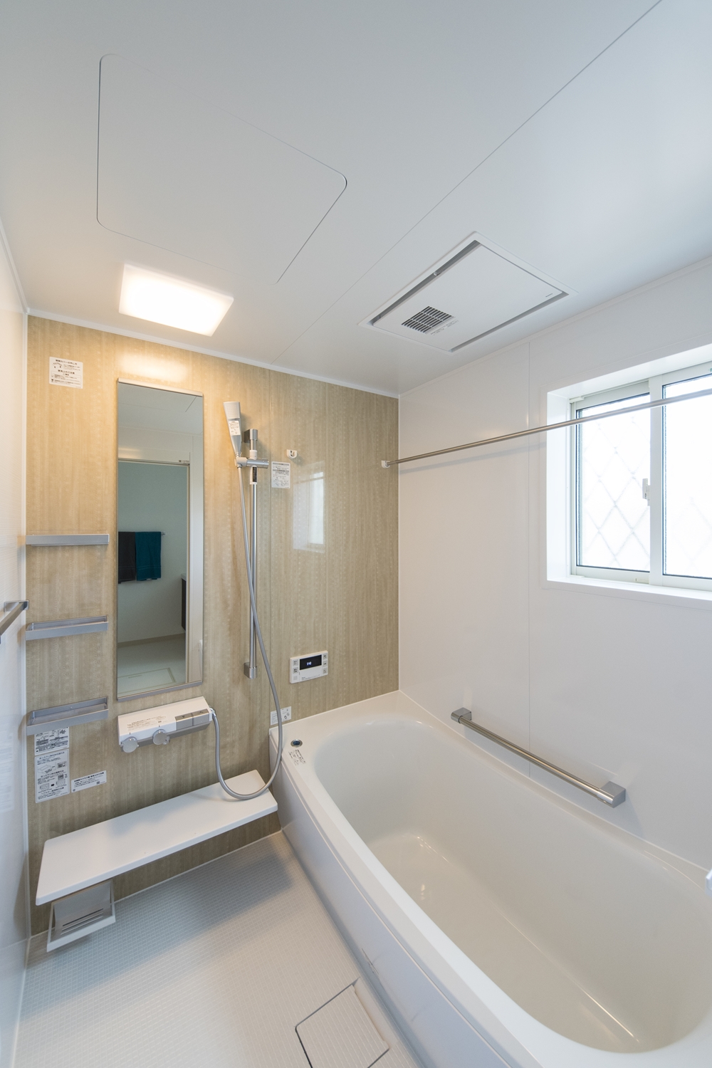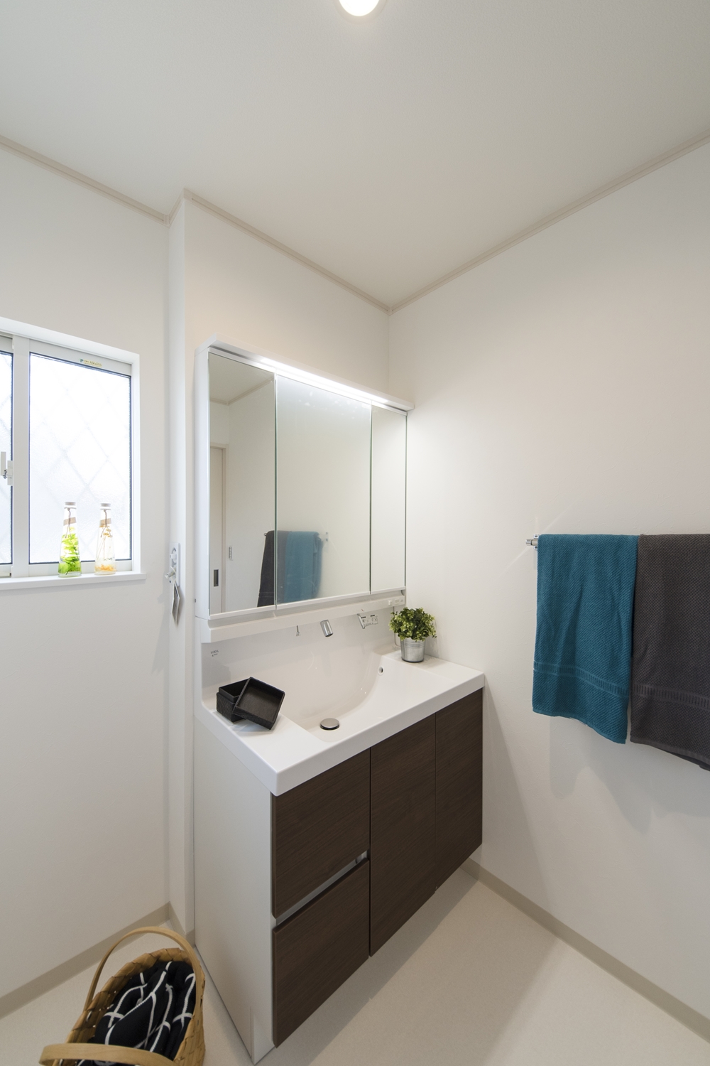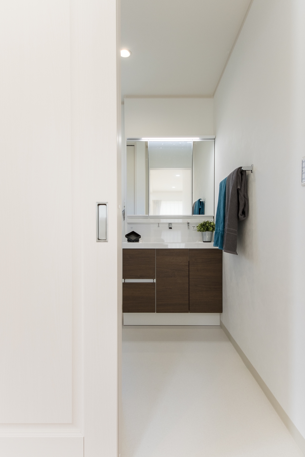 白を基調とした清潔感のあるサニタリールーム。洗面化粧台扉カラーをダークブラウンでアクセントにしました。