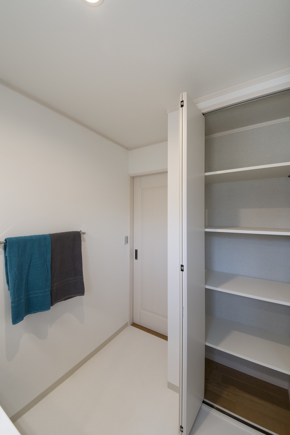 タオルや洗剤等をたっぷり収納できるリネン棚を設置したサニタリールーム。