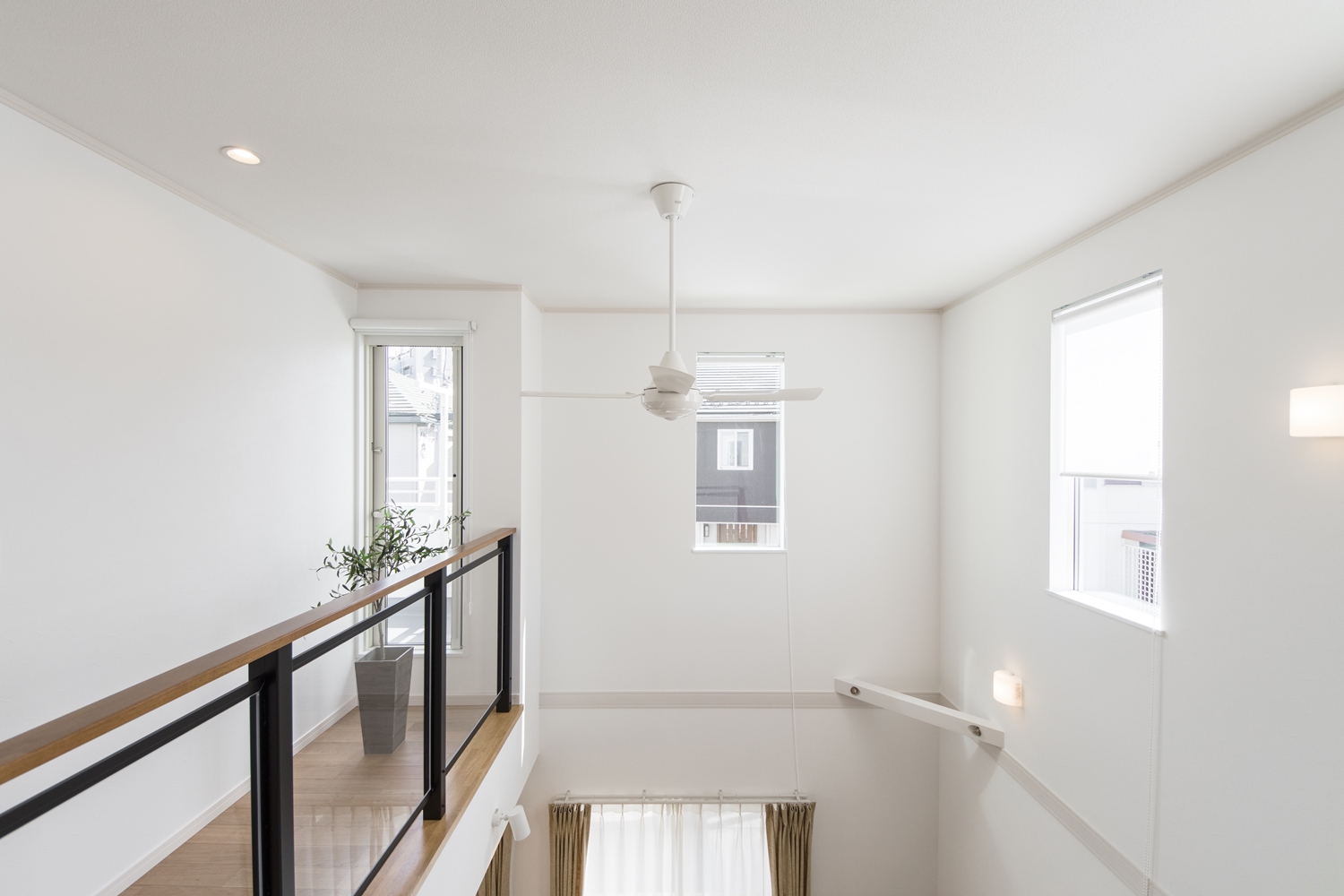 窓から自然のやさしい光が降り注ぐ、明るく開放的な吹抜け空間。