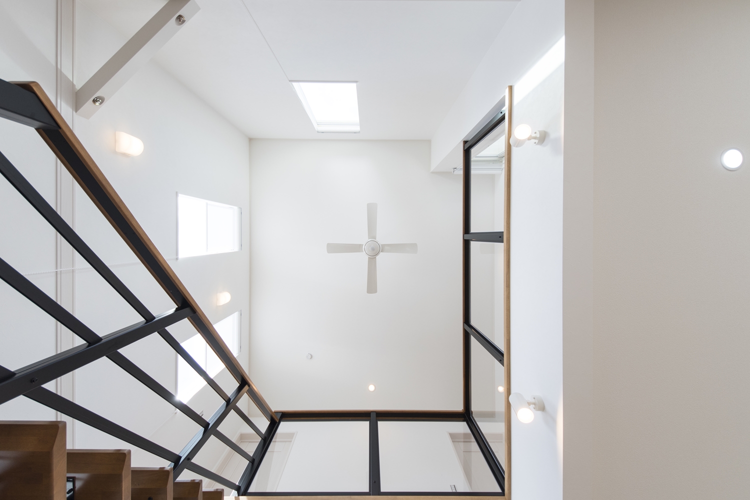 上階からの明るい光が差し込む、光と風が演出する心地よい吹抜け空間。