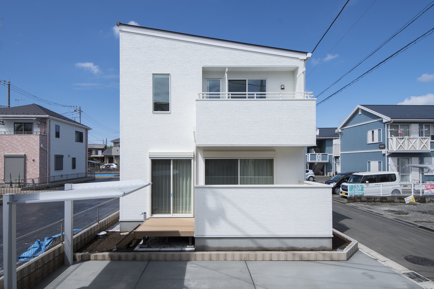 青空に映える真っ白な佇まいの、見る角度によっていろいろな形に見えるオシャレな外観。