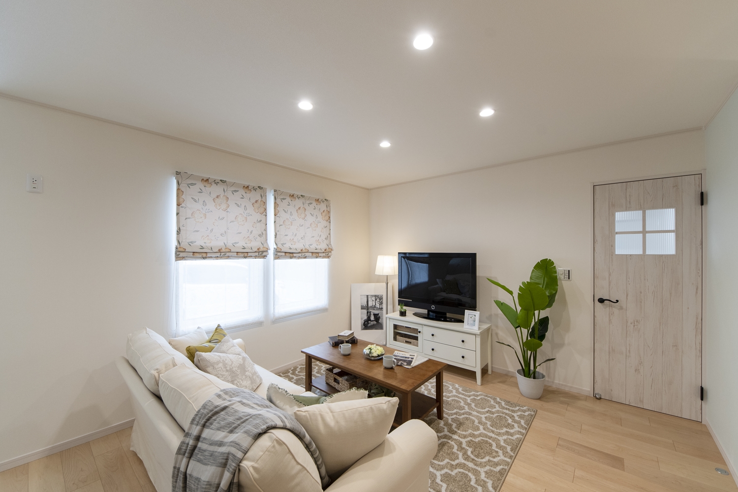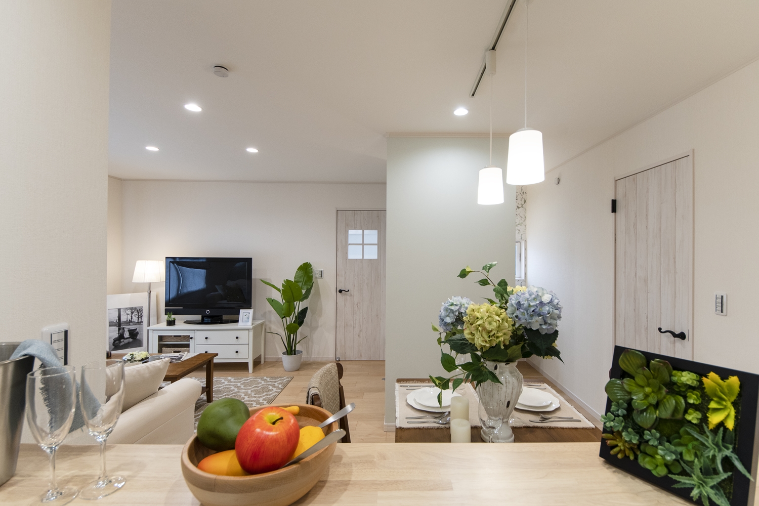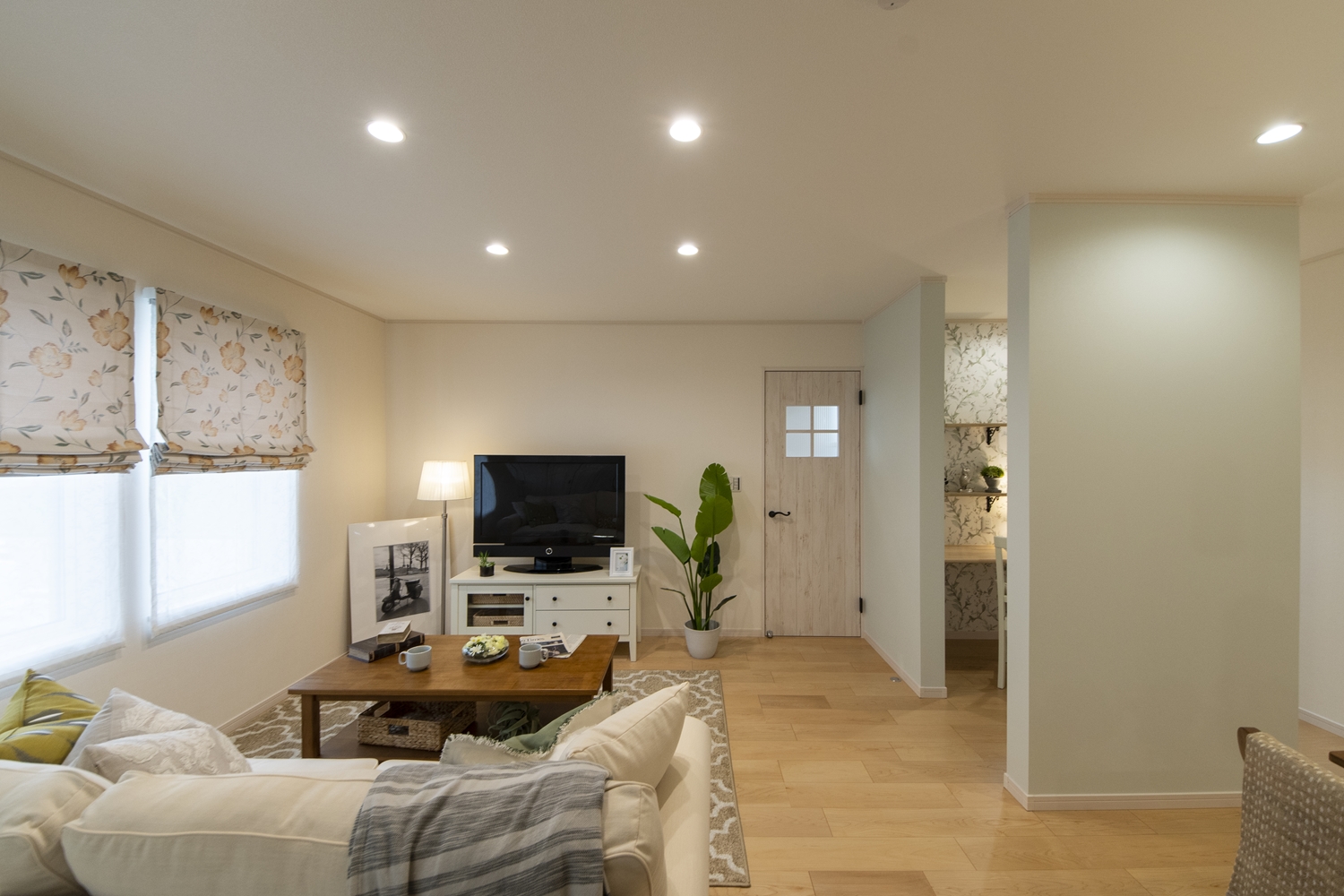 日中は窓からの光が部屋全体を包み込み、夜はダウンライトやおしゃれな照明が空間を彩ります。