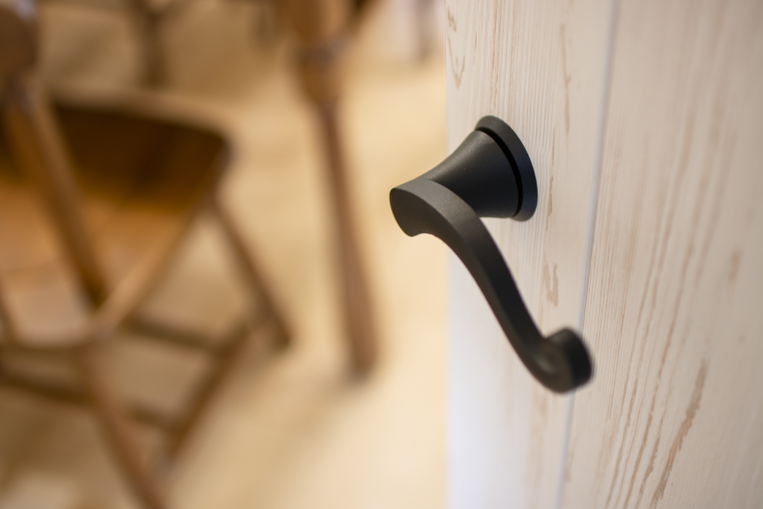 曲線のフォルムが美しい、アイアン調のドアハンドル。