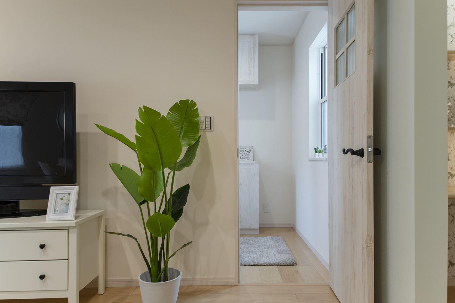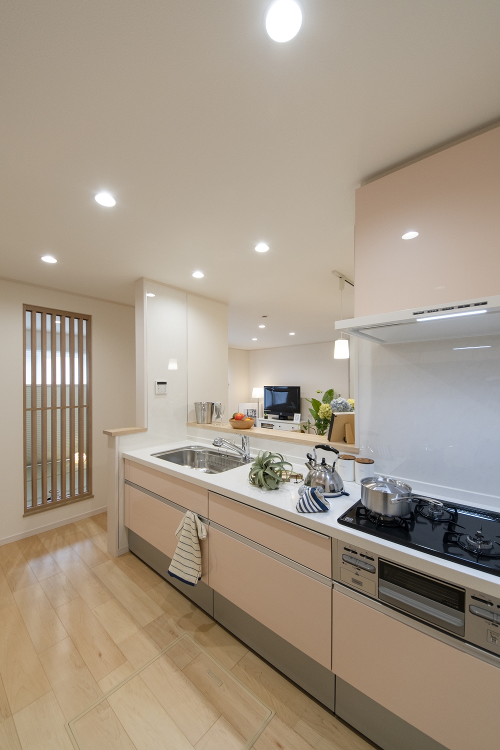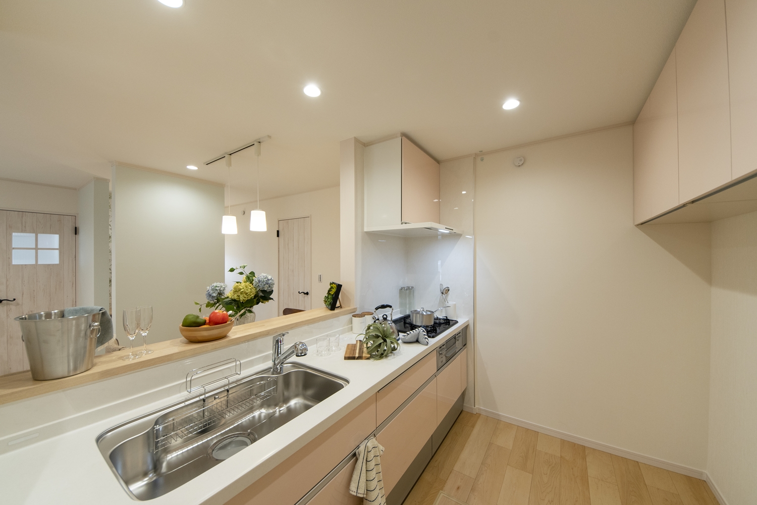 ミストピンクのキッチン扉が可愛らしくキッチンを彩ります。