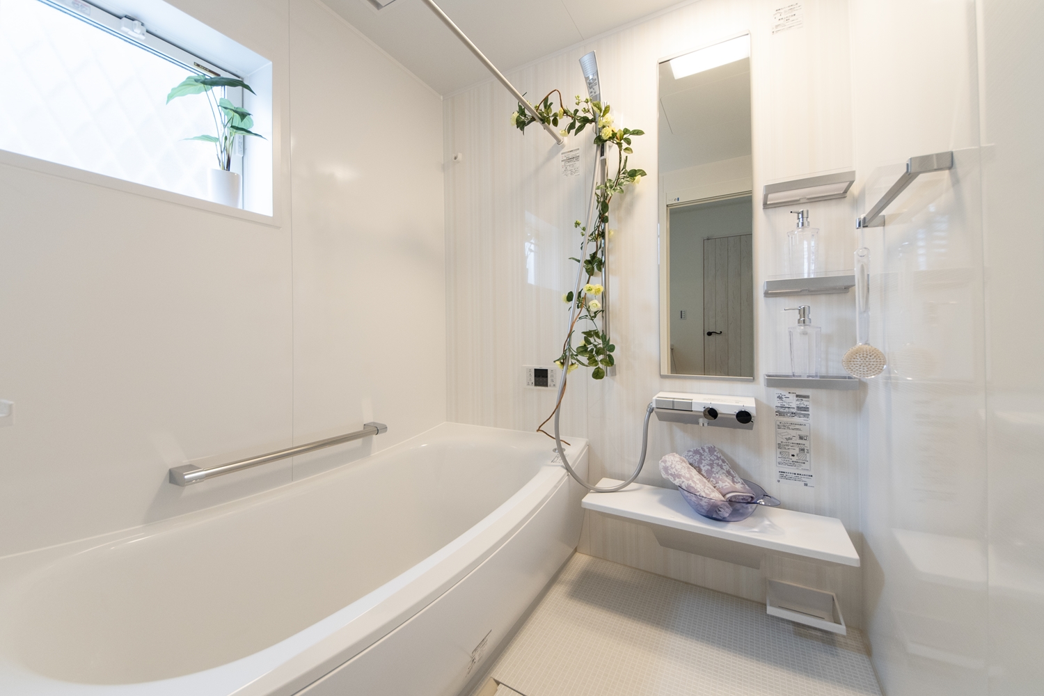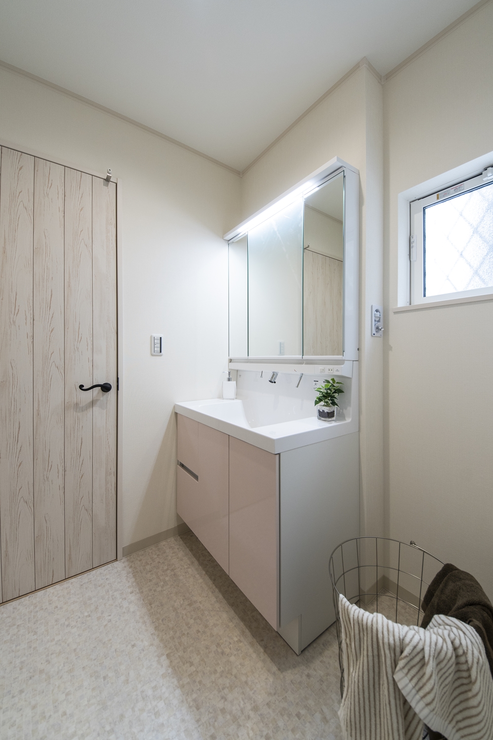 白を基調とした清潔感のあるサニタリールーム。洗面化粧台扉カラーをパステルピンクでアクセントにしました。