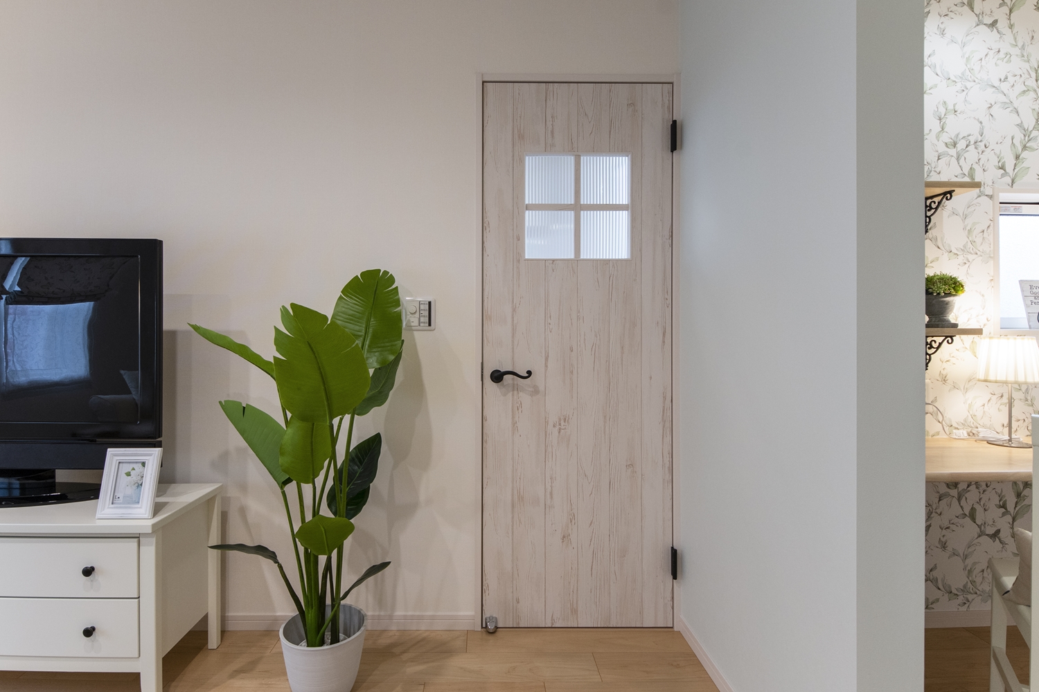 お部屋のアクセント、シャビー感のある木目調のドア。格子の入ったモザイクガラスを施したデザインです。