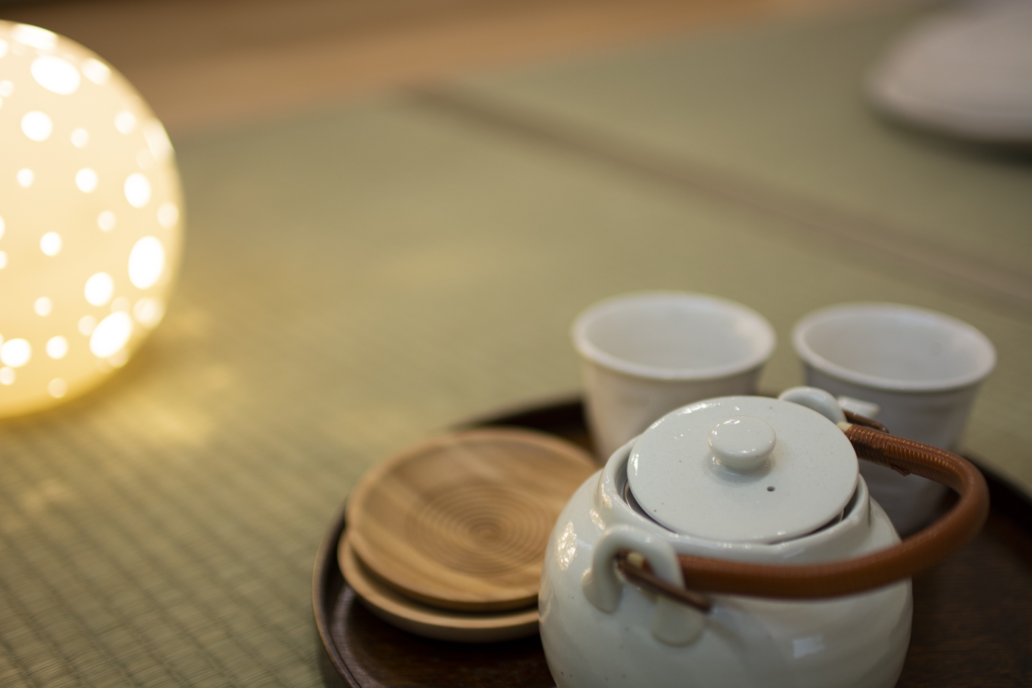 空間をゆるやかに仕切る木目のスリット格子が、シャープで和モダンな雰囲気を演出します。