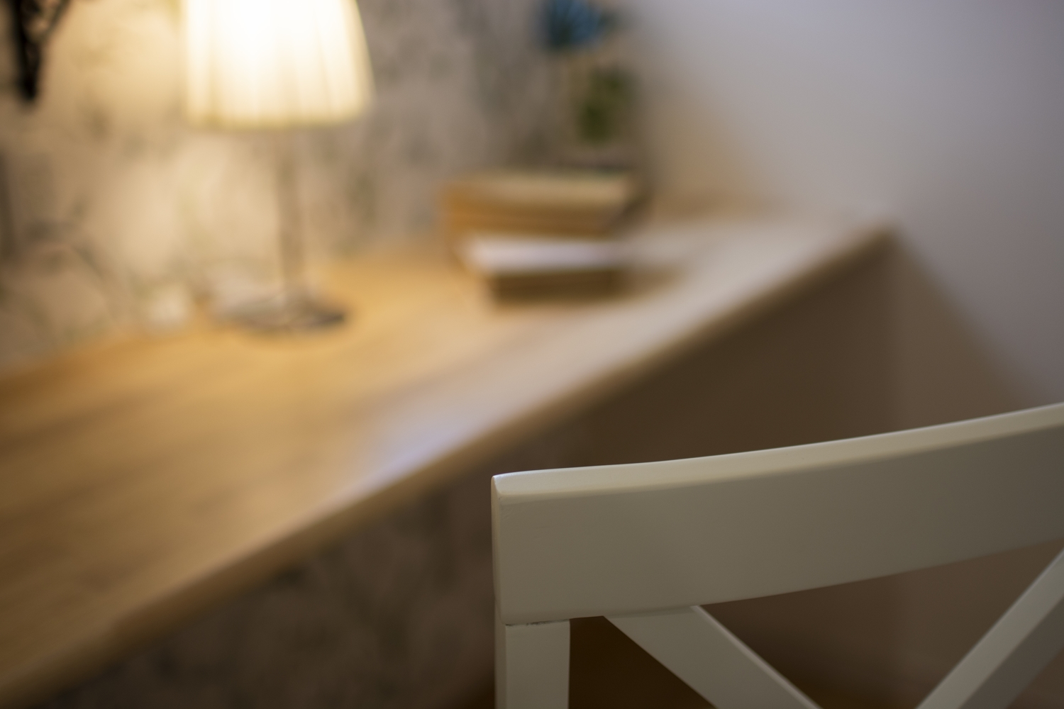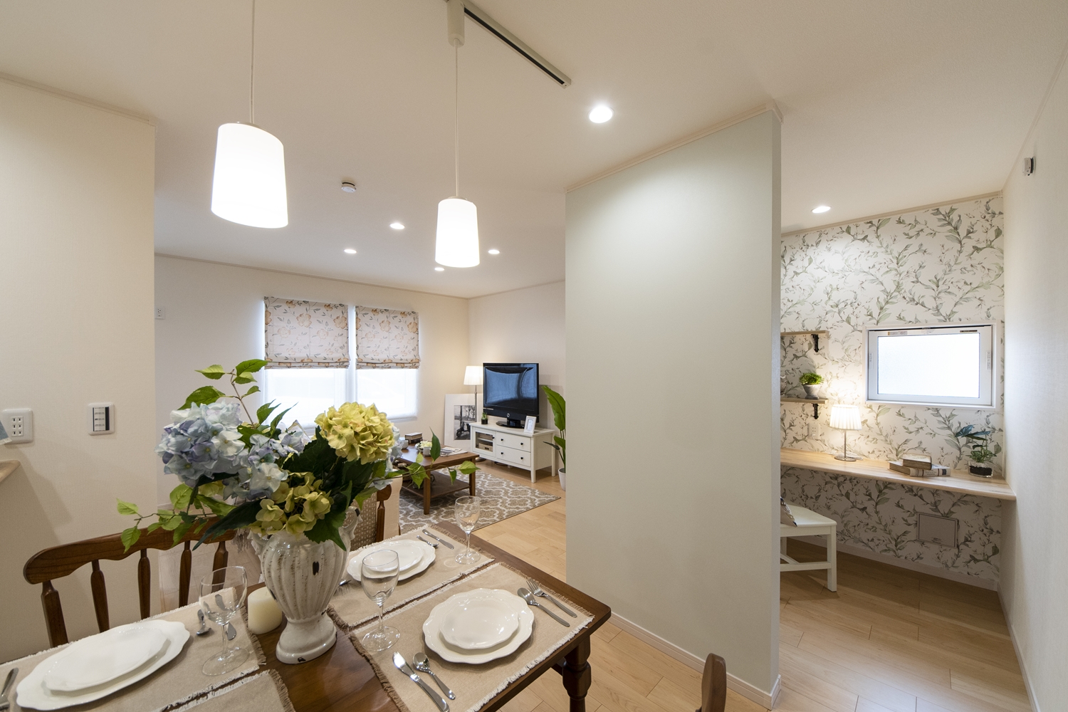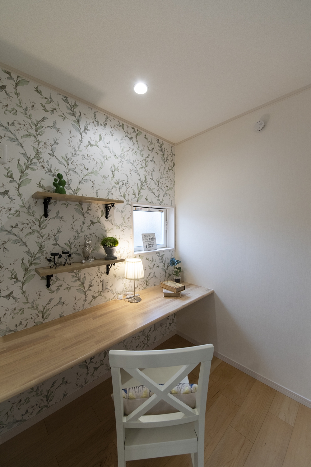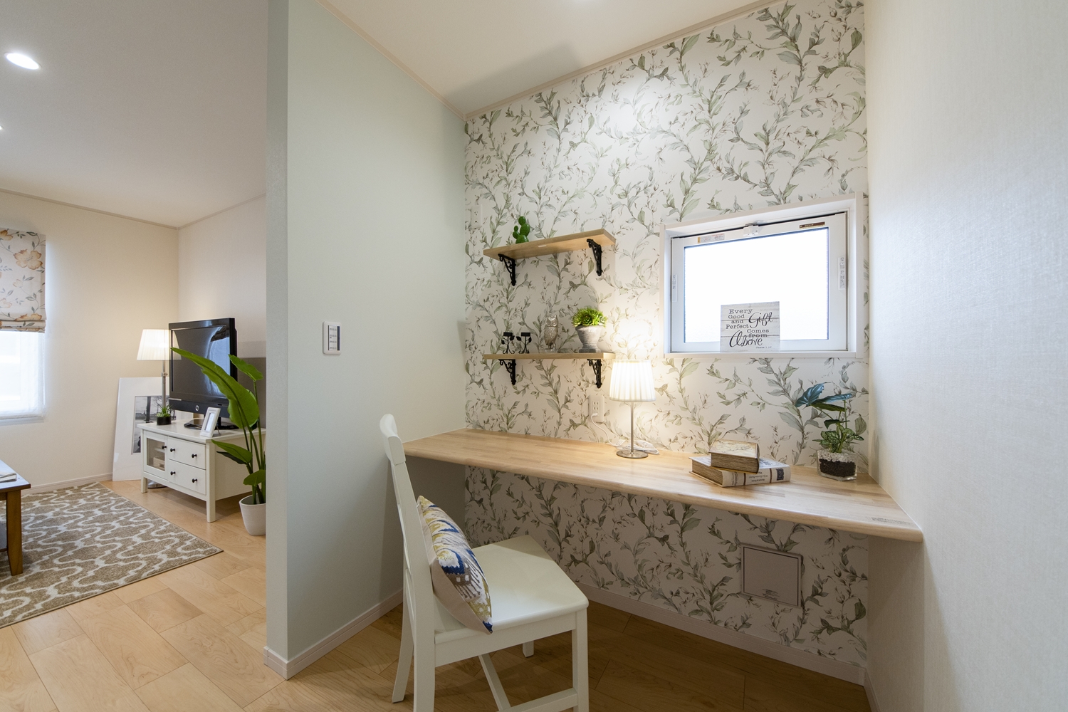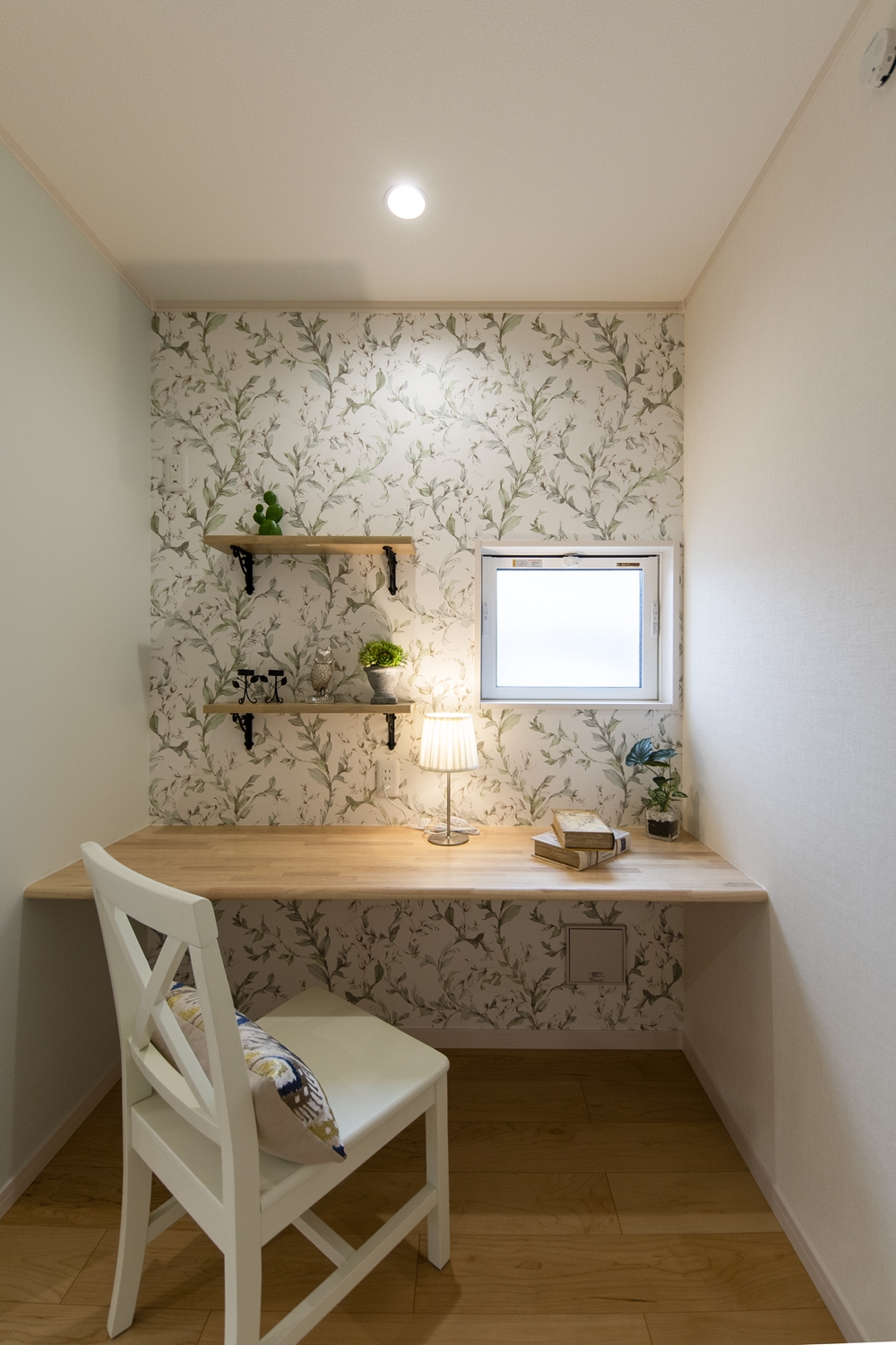 お子様の勉強を見たり、PCを置いて書斎風にも使えるスタディーコーナー。アクセントクロスが空間を彩ります。