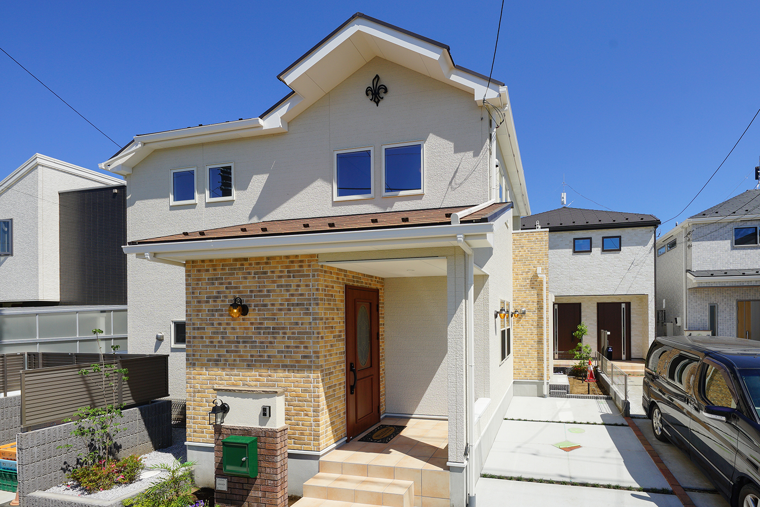 白いサイディングをベースに、表情豊かなレンガ調サイディングのアクセントを付けた、温かみのあるナチュラル&モダンな外観。