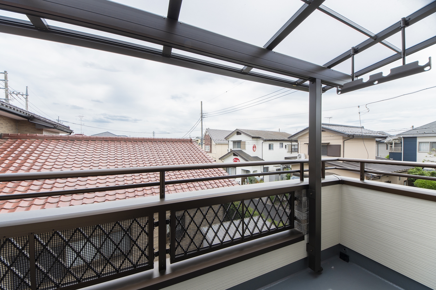 太陽の光が降り注ぐルーフバルコニー。テラス屋根を設置して洗濯物も安心です。