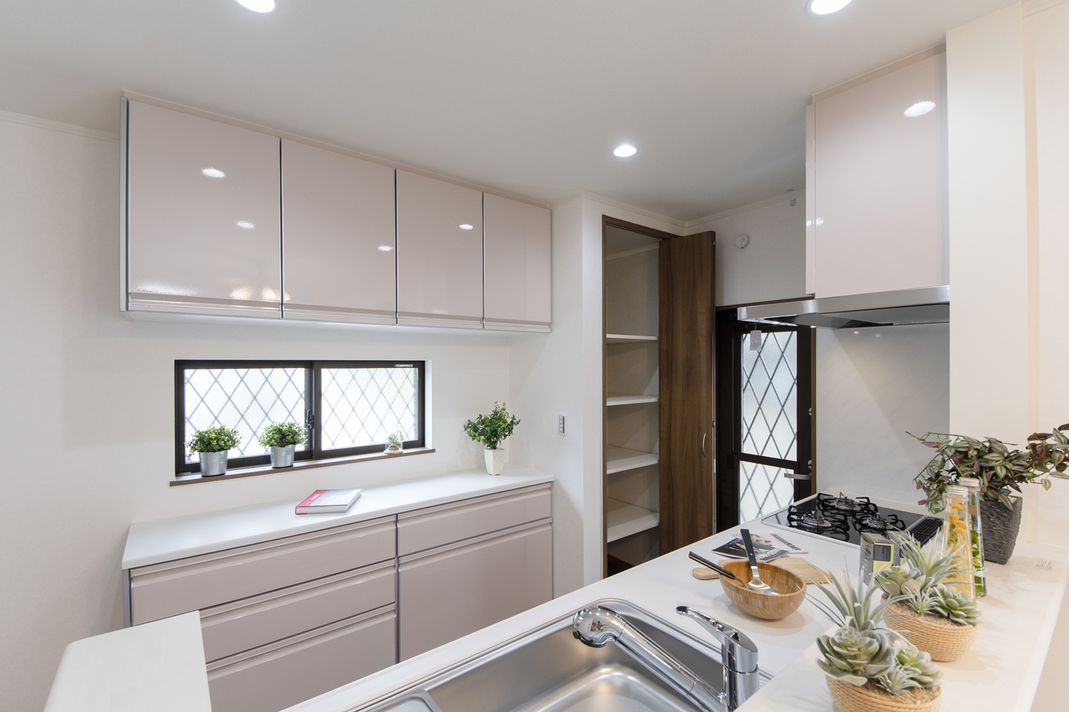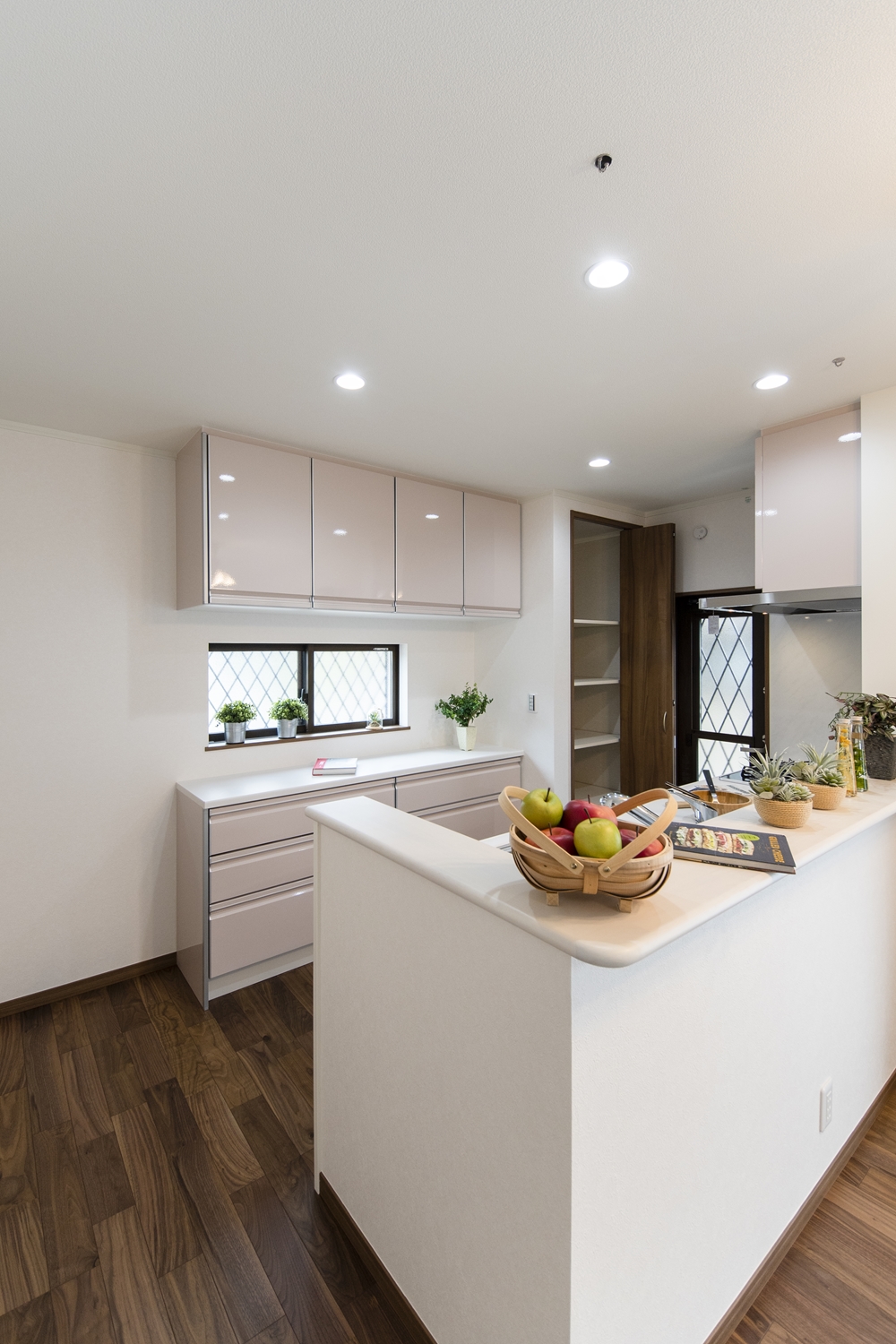お子様を育むキッチンは、明るく、健やかな空間に。清潔感あふれるライトピンクの扉をコーディネート。可愛らしさと、やさしさに包まれたキッチンです。