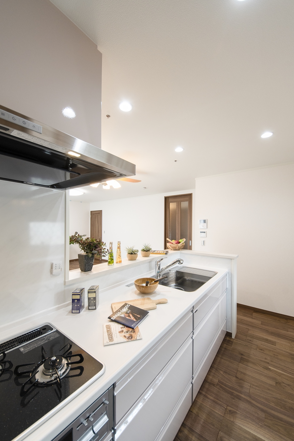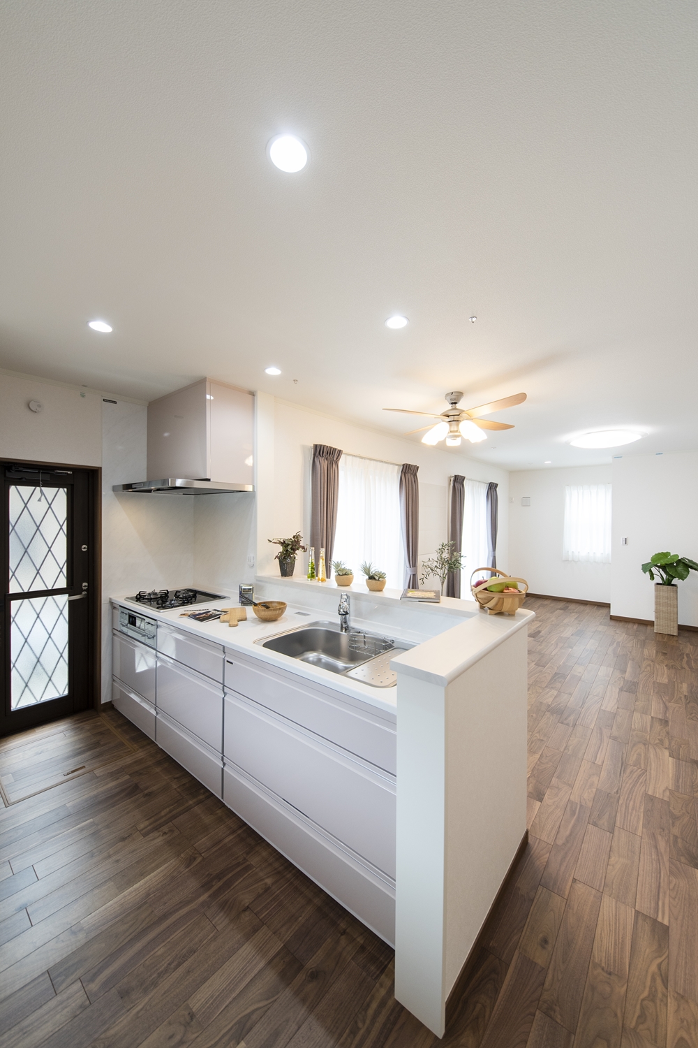 家族のコミュニケーションをはぐくむ対面式キッチン。キッチンカウンターにはアイテムを飾ったりインテリアも楽しめます♪