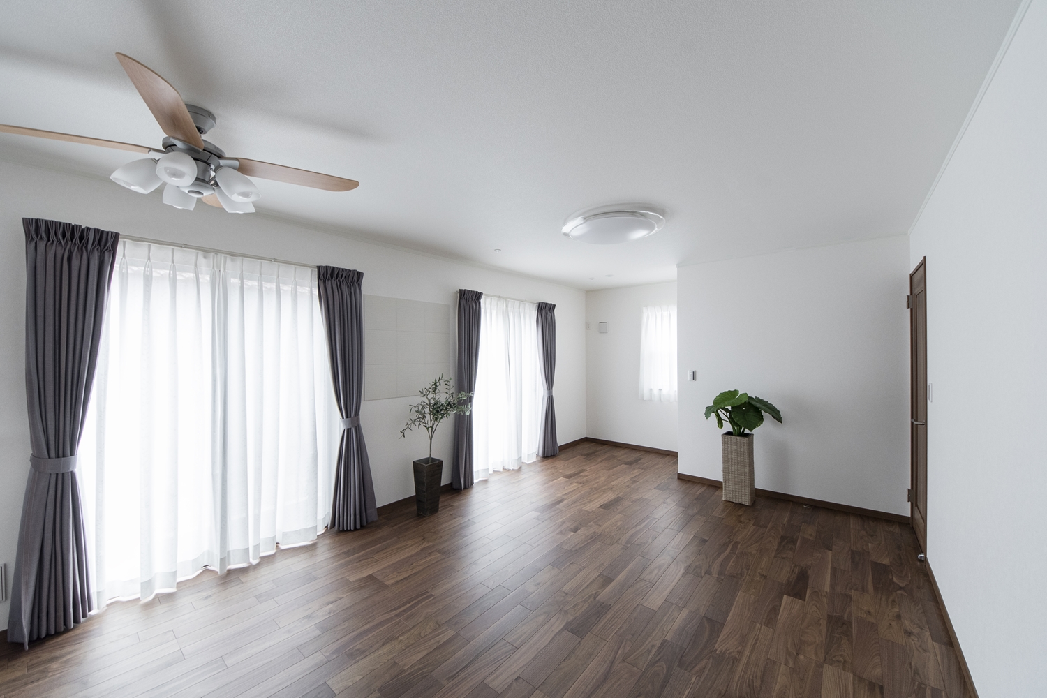 大きな窓から自然のやさしい光が降り注ぐ、明るく開放的なリビング空間。
