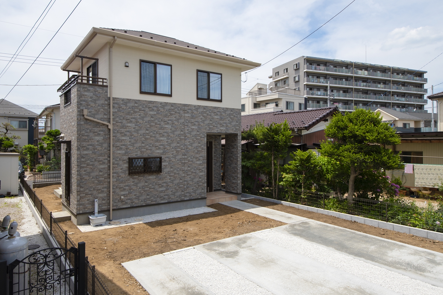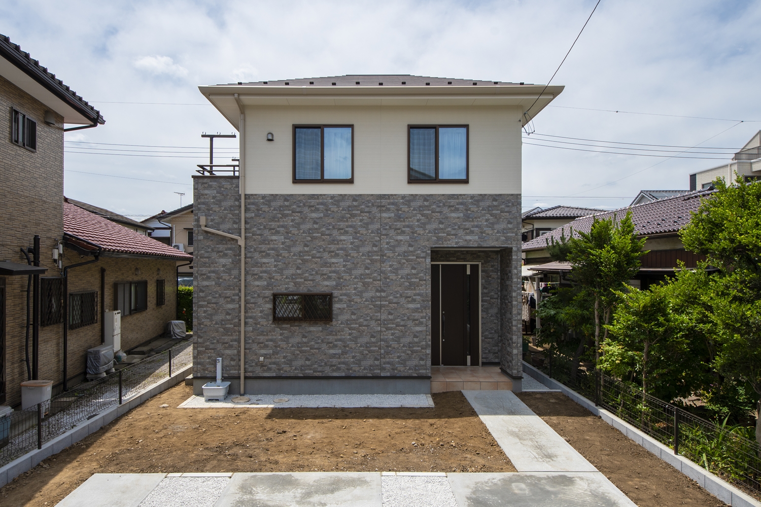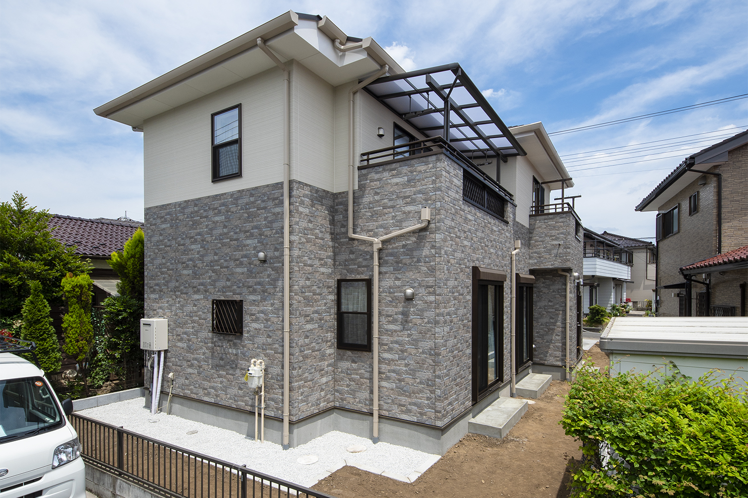 白いサイディングと表情豊かなブラウン系の石目調サイディングを上下に張り分けた、上質感漂う外観。