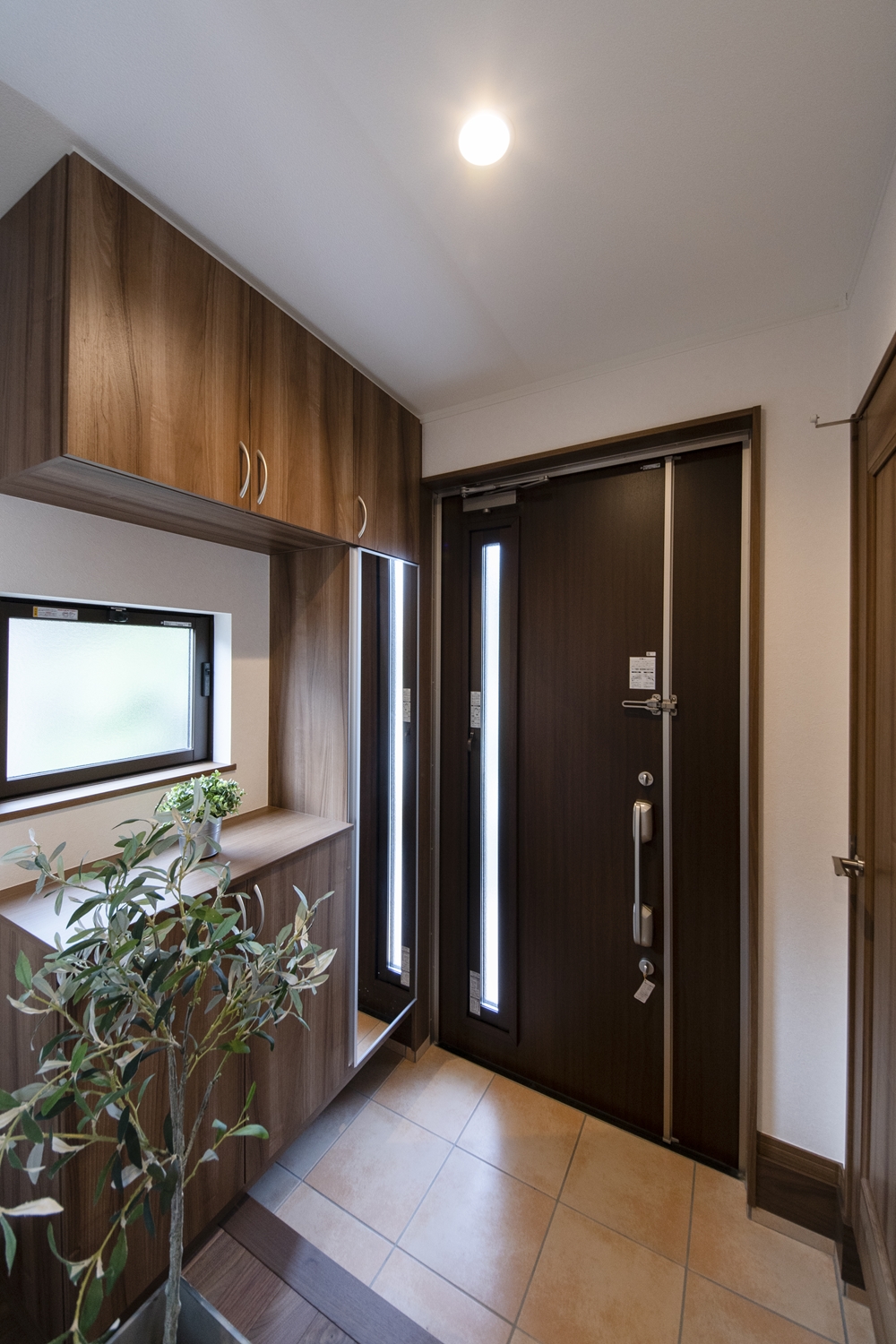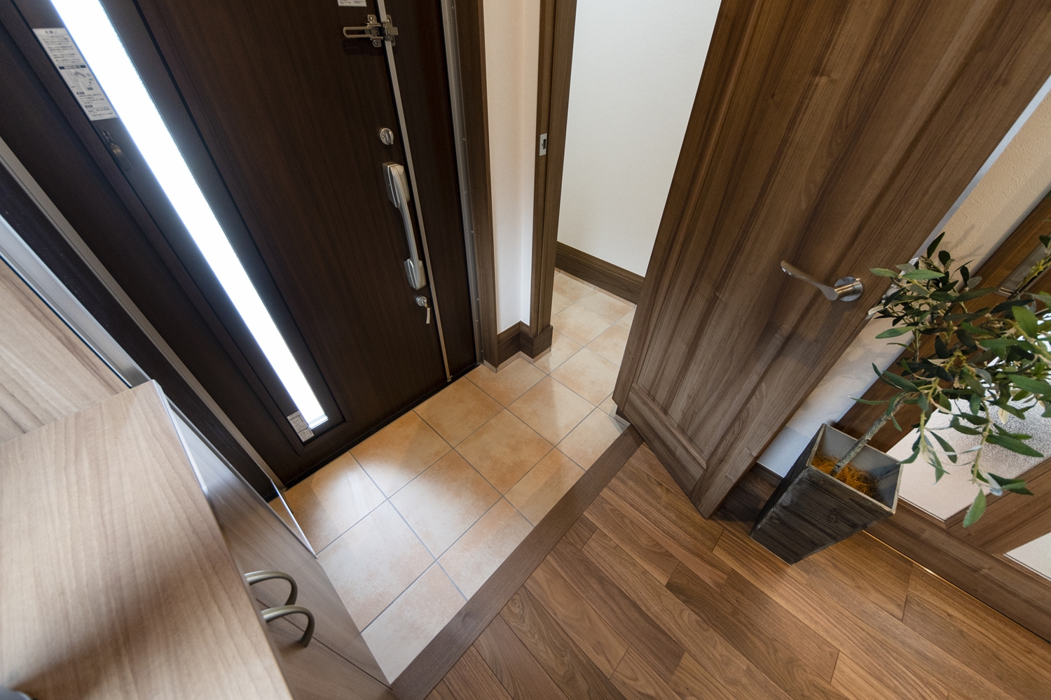 深みある木目カラーの玄関ドア・玄関収納が、上質で落ち着いた雰囲気を演出。