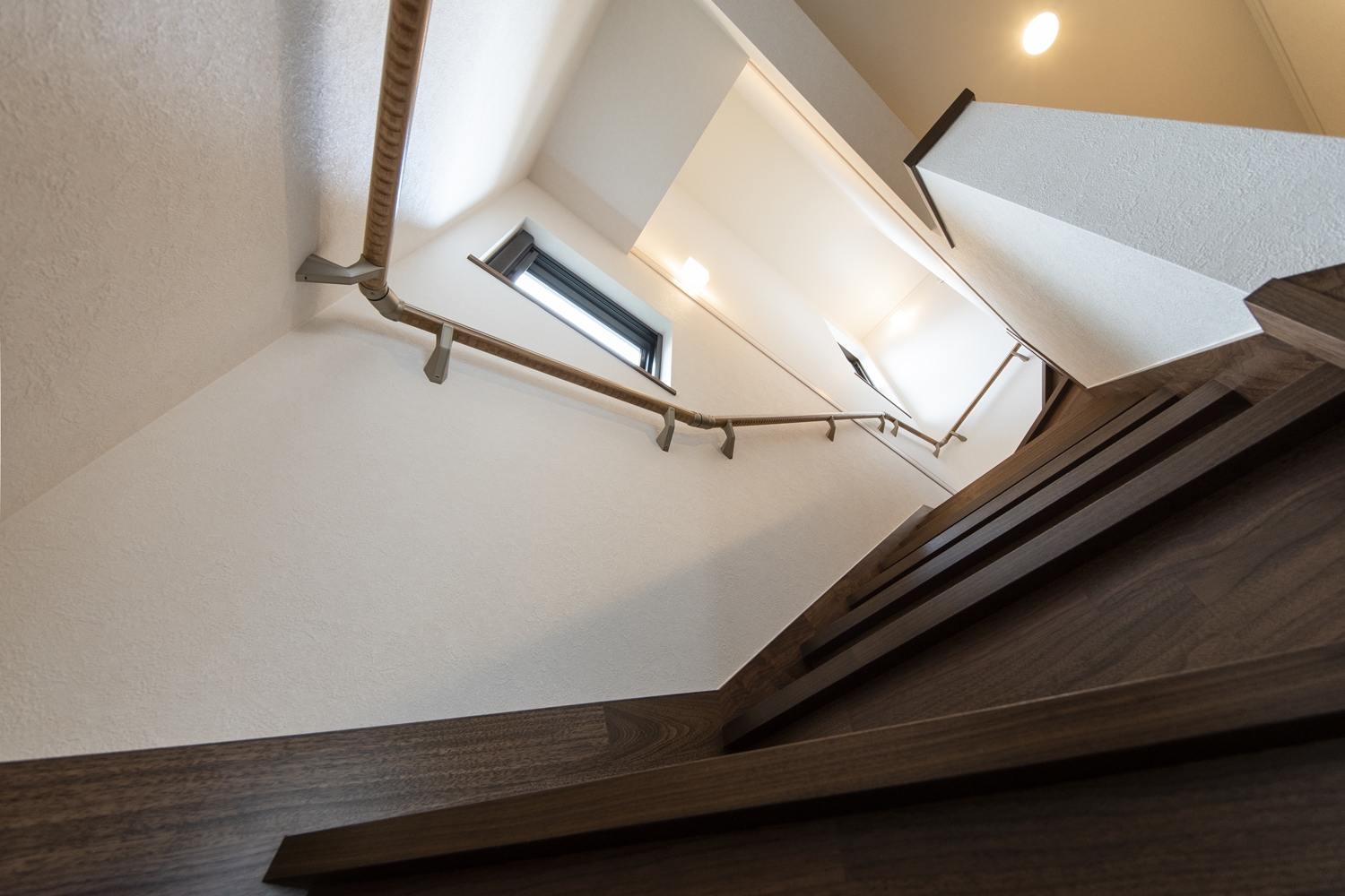 窓からの自然光とブラケットライトのやわらかい光が階段を照らします。
