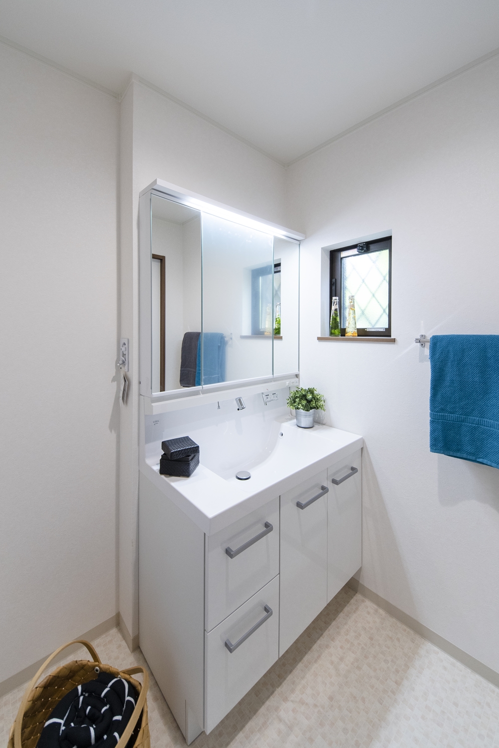 キッチン背面にはキッチンと同じ配色の吊戸棚とカップボードを設置し、備蓄や場所をとるキッチン家電の保管に便利なパントリーを設えました。