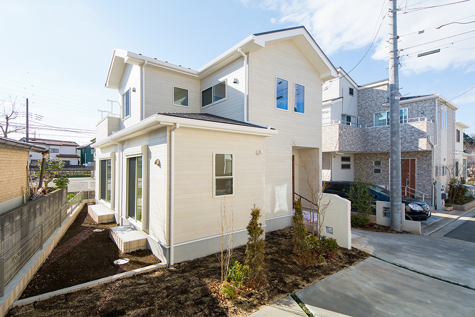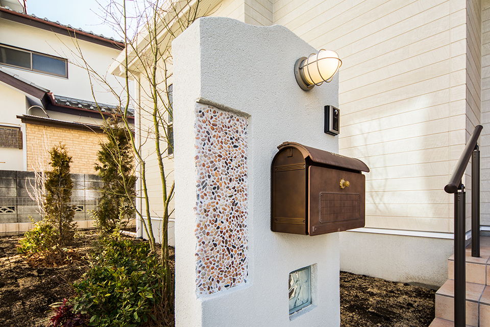 穏やかな住宅街に溶け込む白を基調とした外観。 ダークブラウンの玄関ドアとアイアンブラックの把手、オレンジのタイルがアクセントとなりファサードを彩ります。