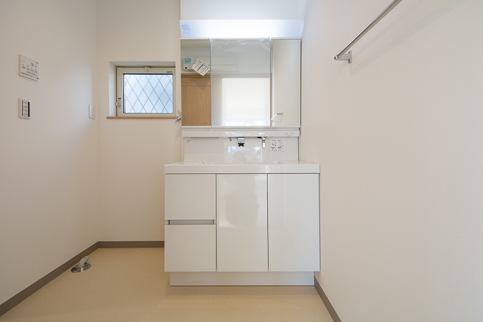 白を基調にブラウン系のアクセントパネルを配した清潔感ある空間。