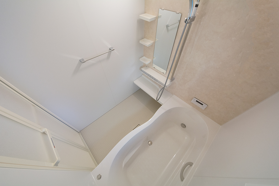 ベージュ系のアクセントパネルを使用した穏やかな印象のバスルーム。