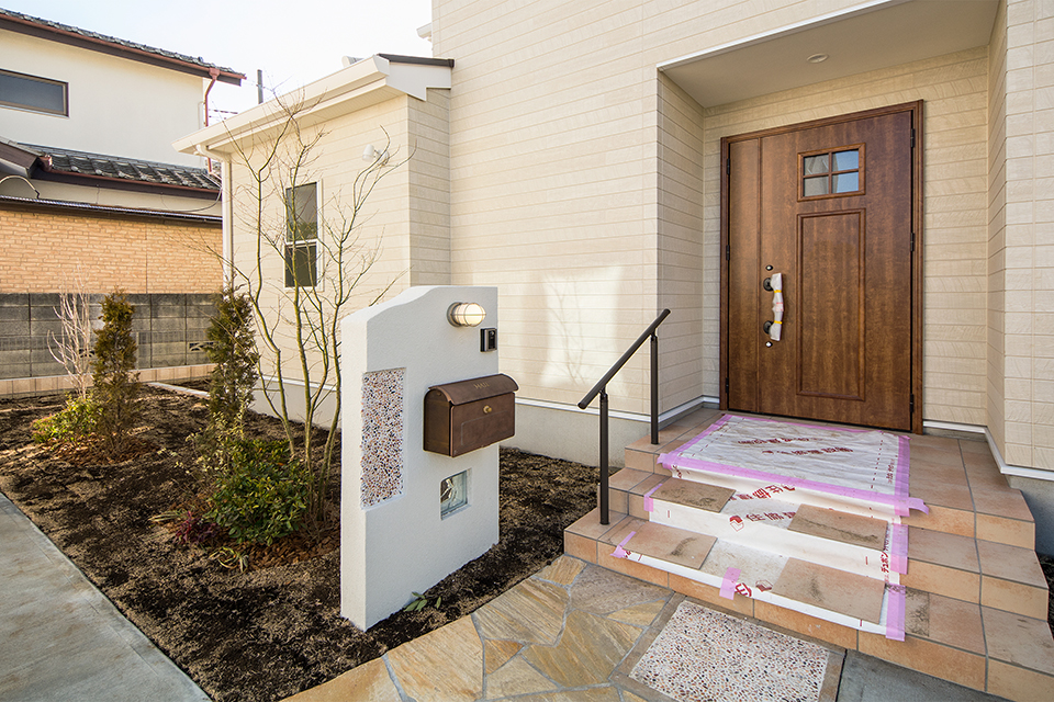 ダークブラウンの玄関ドアとアイアンブラックの把手、オレンジのタイルがアクセントとなりファサードを彩ります。