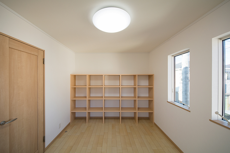 壁一面に造作本棚を設置した2階洋室。小物のディスプレイにも便利です。
