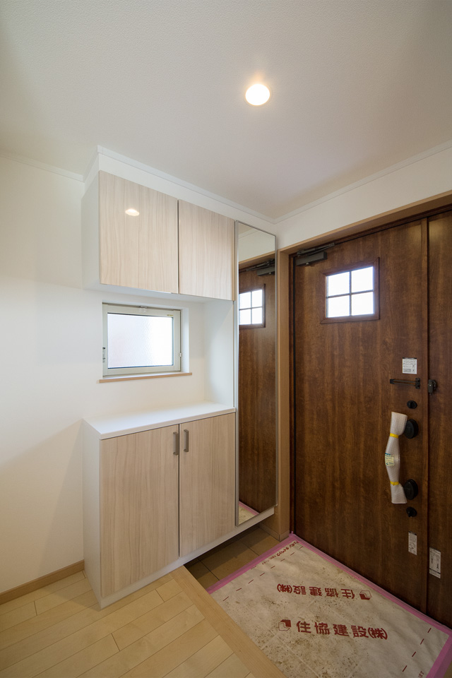 メープル色の鏡面扉が美しい、コの字型玄関収納。