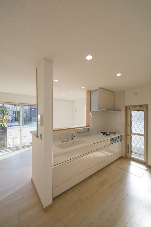 白のワークトップに木目調なシルキーシダーのキッチン扉で清潔感あるキッチンに。