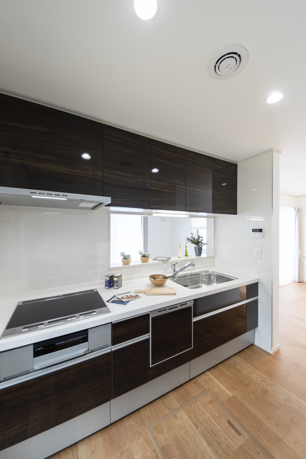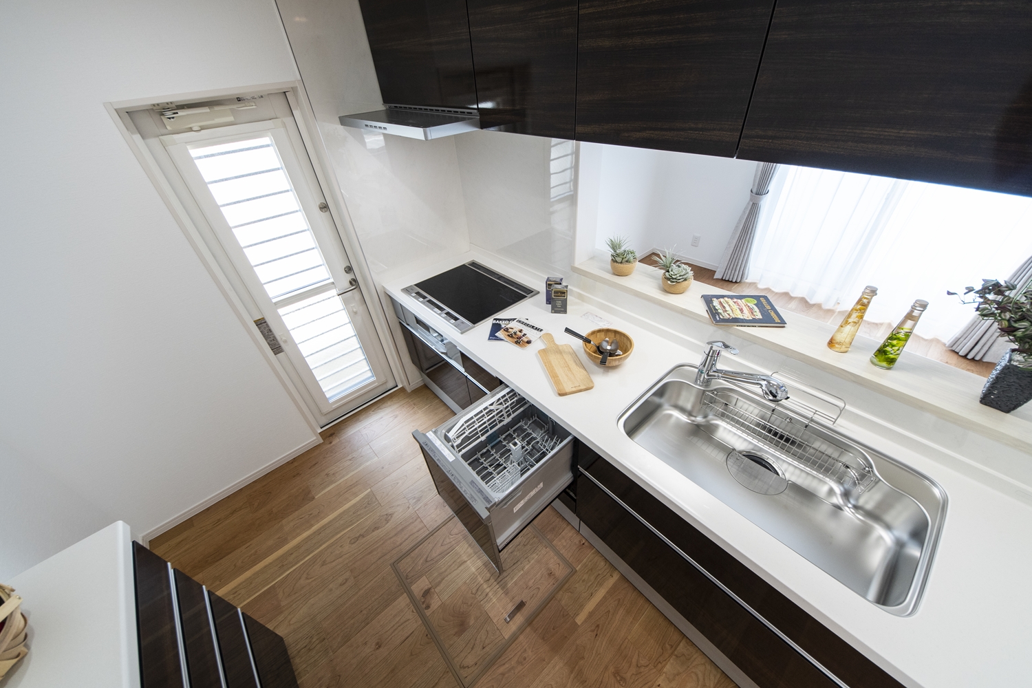 食器洗い乾燥機や、カップボード、吊戸棚を施した、見た目も使い勝手も優秀なキッチン。