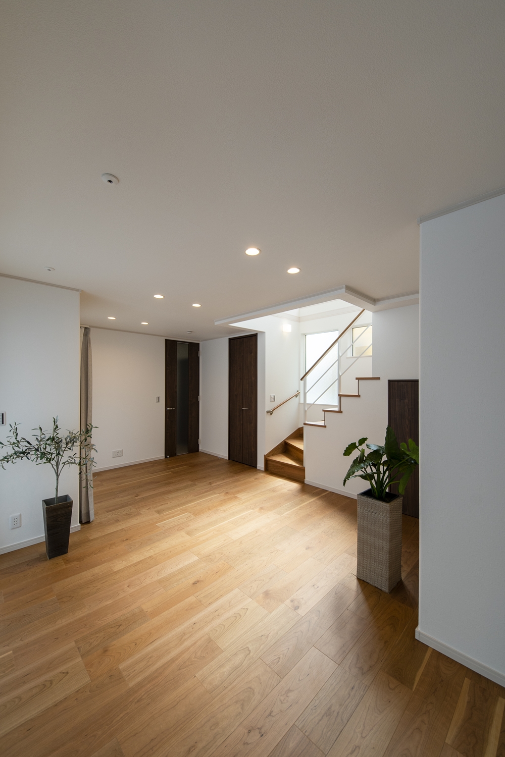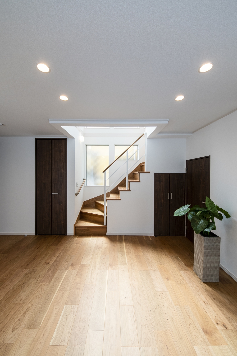 紅褐色のやわらかな木肌の上質感あふれるブラックチェリーのフローリング。吹抜けから明るく照らされ、光の表情を楽しむ空間が生まれました。