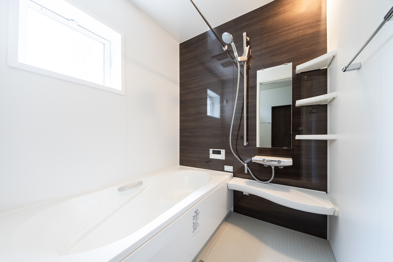 バスルーム/木目の自然な風合いのアクセントパネルが空間に温もりをあたえます。